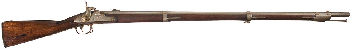 This Model 1816 Springfield Musket has a bolster conversion preformed by Hewes & Phillips of Newark, New Jersey and features a distinctive percussion breech with integral bolster without a clean-out screw. The lock is marked "SPRING / FIELD / 1828" behind the hammer and the eagle shield motif over "US" in front of the hammer, with "H&P" upside down on the bolster and the breech end of barrel dated 1862. Blade and three leaf sights. Inspector initials on the trigger guard plate, with "P" on the barrel. Oval cartouche present on left stock flat.