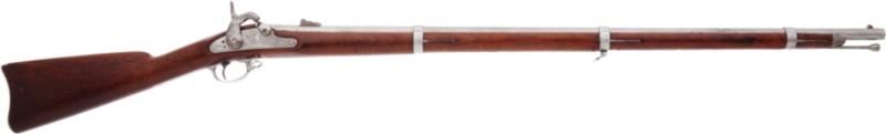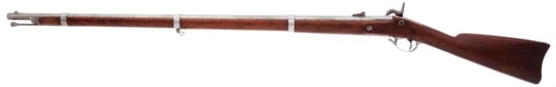 U.S. Springfield Model 1861 Contract Percussion Musket by E. Robinson, N.Y. .58 caliber, 39 1/2-inch barrel with standard sights and barrel bands. Breech marked V./P./[eaglehead]. Top flat marked at breech: 1862. Lock mechanism marked: E. Robinson [in an arc] over New York. Lock dated 1864 and bearing an American eagle motif. Standard walnut stock with steel furniture and sling mounts. Condition: Very good to fine. Metal appears to have been chemically cleaned and shows minor pitting at breech and a grey/white patina overall. Wood fine with minor marks, wear and two clear inspector cartouches. Action crisp.
