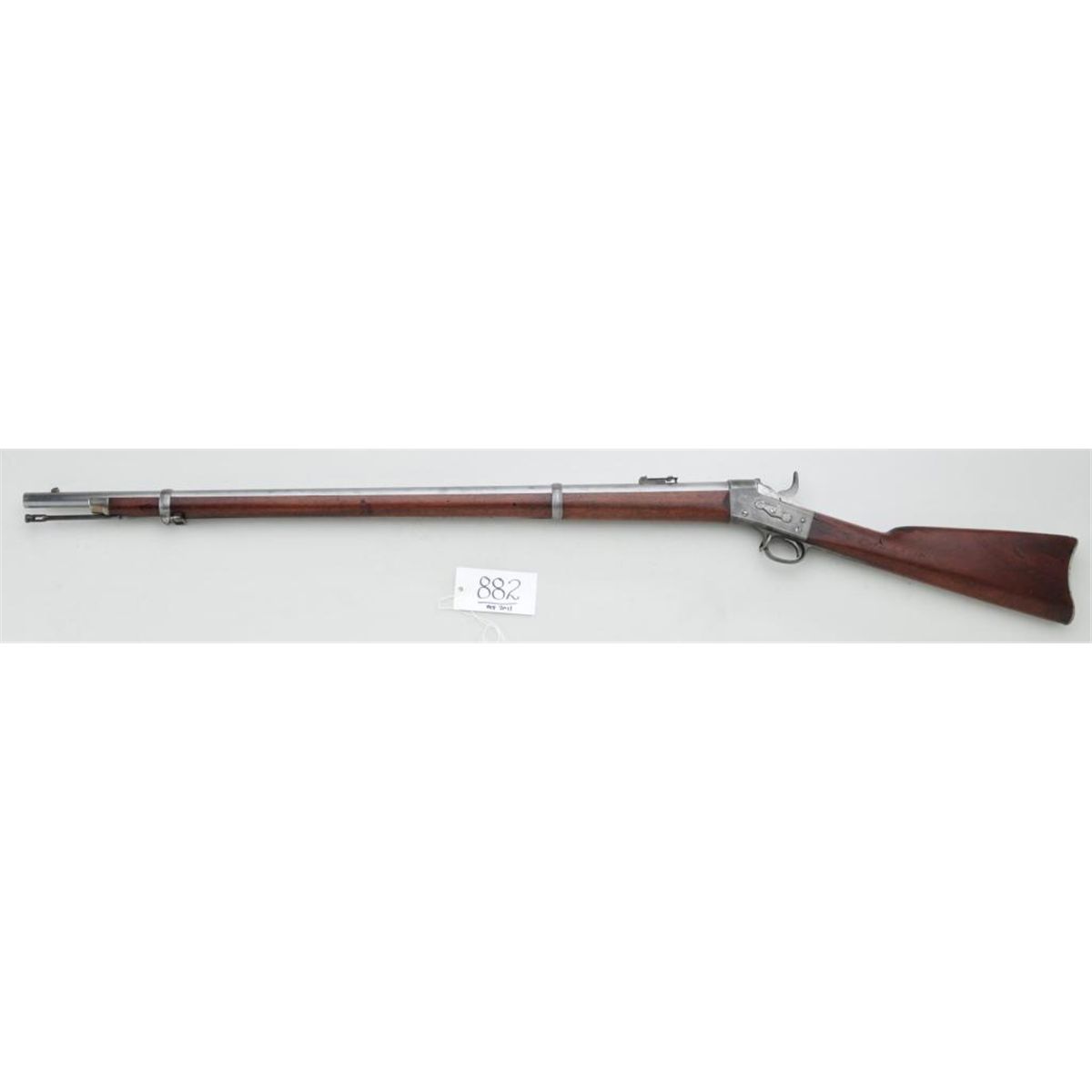 U.S. Springfield Model 1871 Rolling Block Army rifle, .50 cal., 36” round barrel, bright and case hardened finish, wood stocks, two barrel bands, sling swivels iron cleaning rod, wood stocks, #NVSN. This gunis in overall fine condition showing a grey patina on the barrel that is “in the white”, ample original case colors can be seen on the receiver with the balance gone to a darker grey patina that the barrel; fine bore, crisp action, sharp markings on the frame with spread American eagle, U.S. Springfield and dated 1872; overall fine wood stocks with sharp inspector’s cartouche on the left side of the butt stock at the wrist with somescattered nicks and mars from storage. A really nice example of this martial rifle. Est.: $2,000-$3,000.