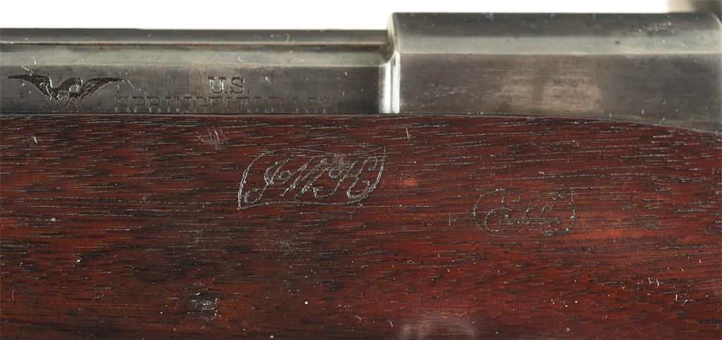 This is a very fine example of one of the 1,011 U.S. Springfield Model 1871 Ward-Burton trials rifles. The Ward-Burton Rifle is one of the earliest bolt action rifles issued by the U.S. Army. The left receiver flat is marked with the U.S. Eagle and Shield motif followed by "U.S./SPRINGFIELD 1871". The top of the bolt is marked "WARD BURTON PATENT/DEC. 20,1859-FEB 21, 1871". The receiver is casehardened, the bolt is bright and the remaining parts were finished in Armory Bright polish. The front sight is fixed and the rear sight is a folding leaf mounted just ahead of the receiver and is graduated to 900 yards and has a 1,000 yard center notch. It is fitted with a one-piece straight grip walnut stock with a steel nose cap; two barrel bands and a steel buttplate marked "U.S." on the tang. The left side of the stock has the boxed "J.W.K." and small oval "ESA" cartouches with a small boxed cartouche with an intertwined "AB/L" initial inside. There is a sling swivel mounted on the forward barrel band and on the front of the trigger guard. It is complete with an original model 1868 trapdoor ramrod. The consignor stated that this rifle was formerly in the Burt Kellerstedt Collection.