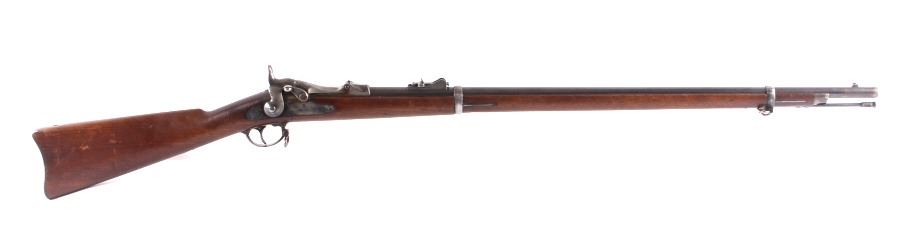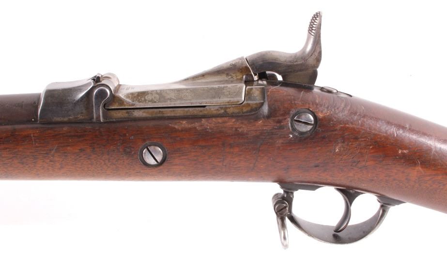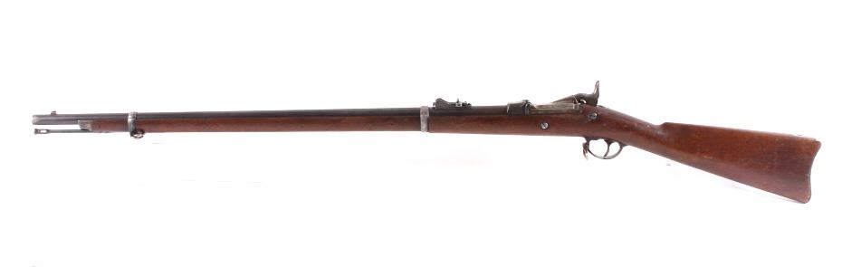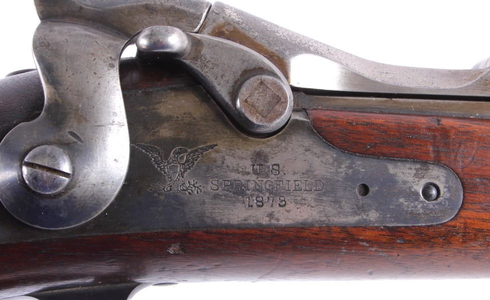This is a U.S. Springfield Model 1873 Trapdoor rifle chambered in the .45-70 and manufactured in 1881. The rifle features a solid walnut hardwood stock and is nicknamed the "Trapdoor" for the way in which the receiver is opened to load and eject a cartridge. The side plate is marked "U.S. Springfield 1873 with the eagle holding a shield and arrows. The top of the receiver is marked "U.S. Model 1873". The back of the receiver is marked with five point star and the serial number "152994". The steel butt plate is marked "U.S". This rifle comes with the original cleaning rod as well. The Springfield Trapdoor rifle is in good condition. It measures 52" long with a 32.5" barrel. NO FFL required for transfer.