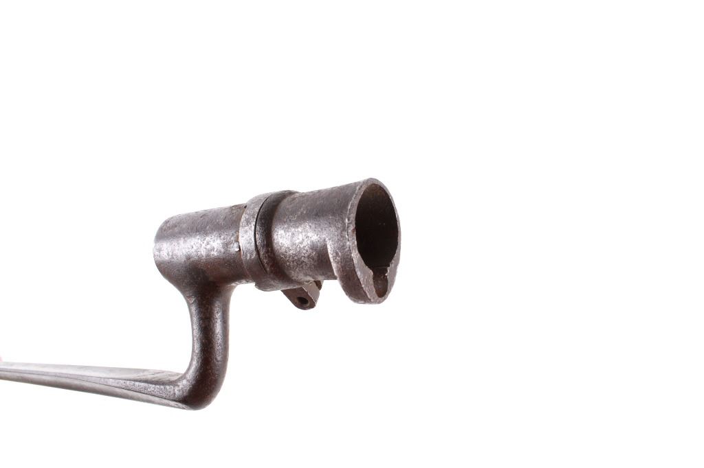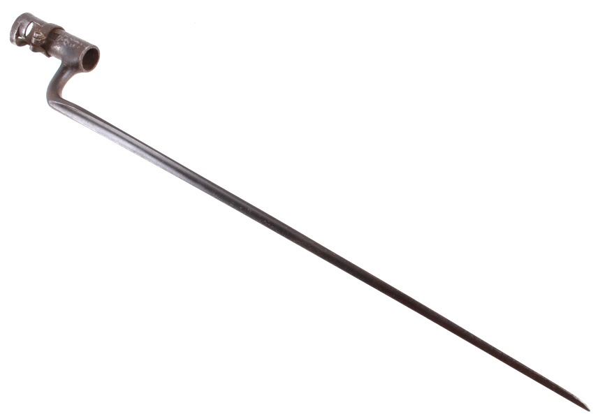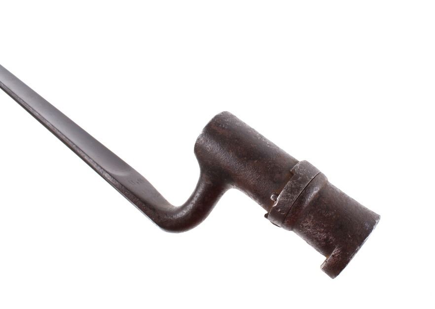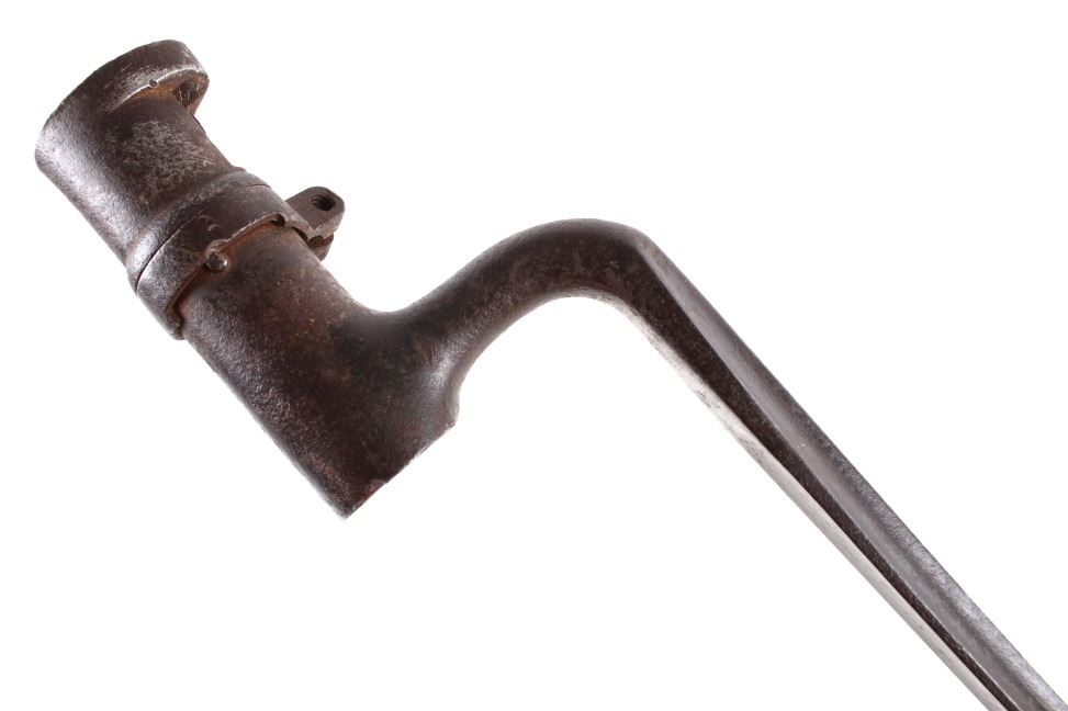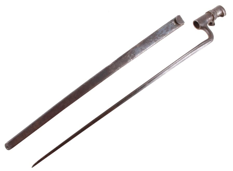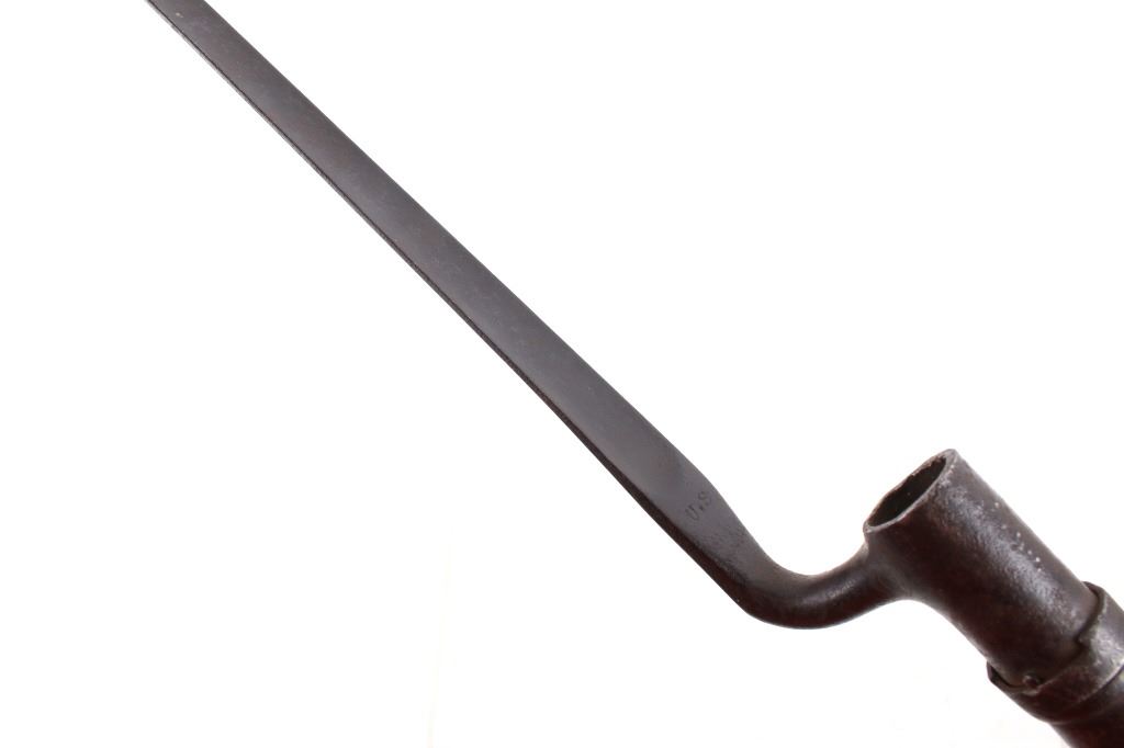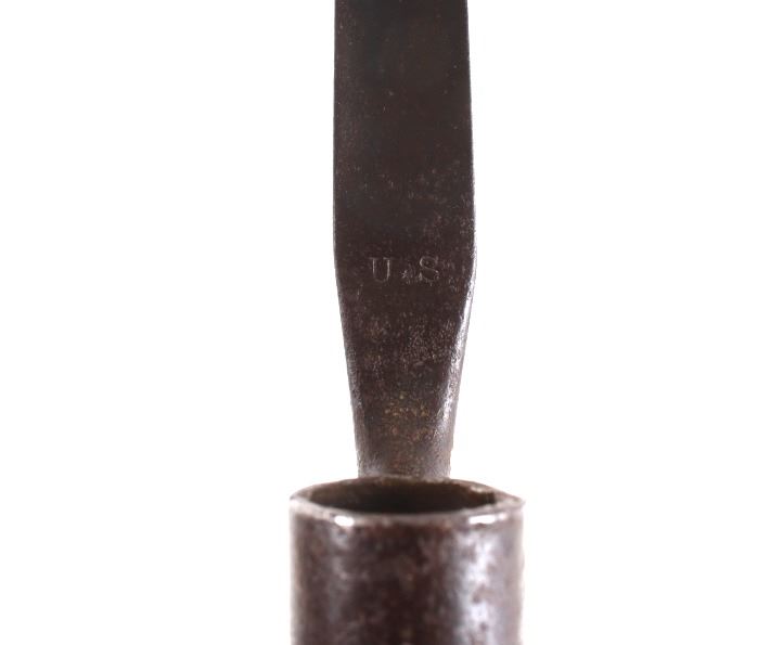 Included in this lot are a U.S. Springfield model 1873 trapdoor bayonet and scabbard. The model 1873 bayonet and scabbard was made for the iconic Indian Wars and Spanish American War Trapdoor Springfield Rifle, caliber .45-70 that was in service from 1873 up until the end of the 19th century. The triple blade is marked "U.S.” near the base. The piece comes with its original metal sheath. The piece is in good condition overall, with some discoloration on the scabbard; the bayonet has some slight pitting. The bayonet measures 21" long with the blade being 18" long.