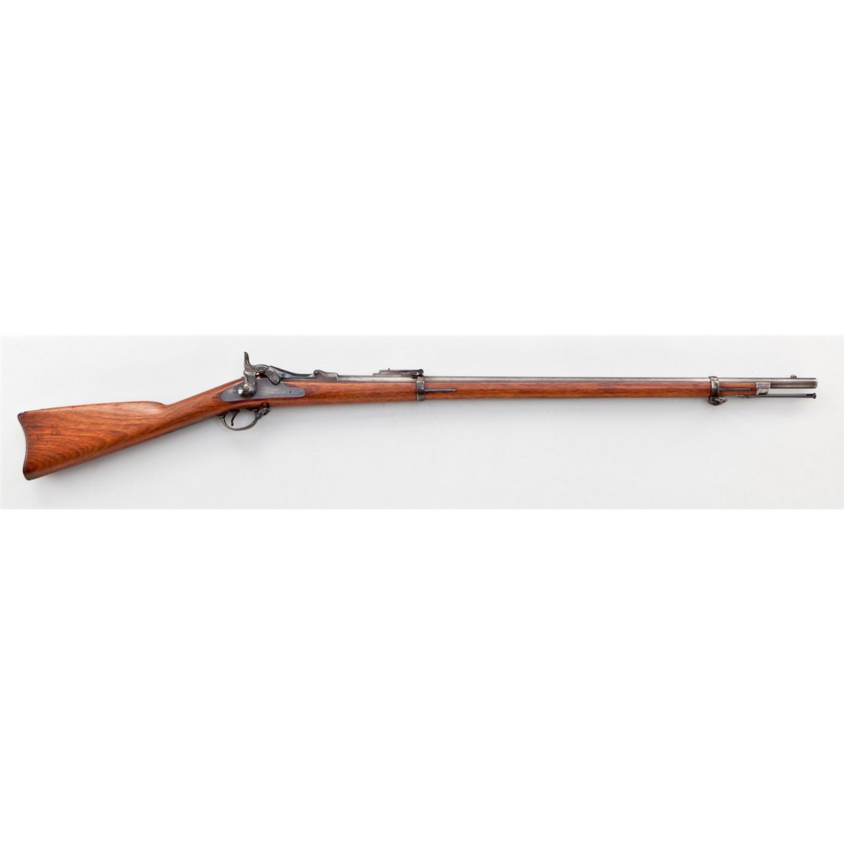 U.S. Springfield Model 1873 Trapdoor Military Rifle, #51329, .45-70 cal., 32-5/8'' barrel with pedestal front sight and Buffington rear sight; blued finish, case-hardened breechblock, two-piece triggerguard, walnut stock with faint cartouche and right side faintly marked ''16/601I 2nd''. Condition is good as refinished retaining approx. 80% of a reblued finish with scattered wear and light patches of pitting visible beneath reblue; lock shows original blue. Serial number is very faint. Stock has been sanded and shows light wear and marks. Action is crisp, bore is clean. Est.: $600-$800.