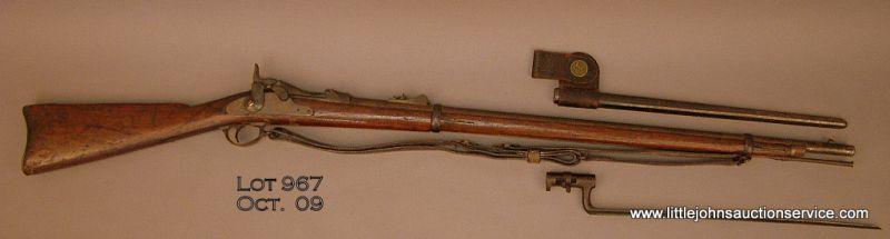 U.S. Springfield Model 1873 Trapdoor rifle with socket bayonet, metal scabbard and leather frog with brass US insignia, #351256. This gun is in out-of-the-attic overall fair + to good condition showing scattered surface rust over metalsurfaces, surprisingly good bore, crisp action, no markings are on the lock plate, wood shows old coating of varnish and is in overall good condition with scattered nicks, mars and scratches from carry and storage; old military leathersling; good overall condition bayonet and scabbard assembly. Est.: $400-$800.