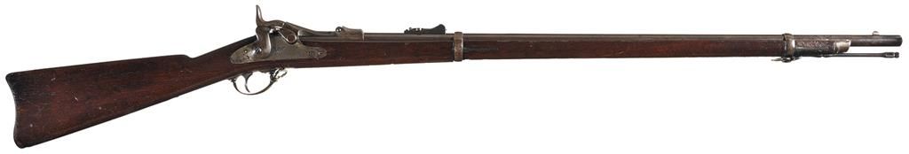 Manufactured in 1877 and 1878, this model was also known as the Transitional 1873/1879 with a total production of only approximately 25,500. The lock is marked with the eagle/shield motif followed by "U.S./SPRINGFIELD" ahead of the hammer and the top of the low arch breechblock is marked "U.S./MODEL/1873". The left rear of the barrel is marked with the "V/P/eagle head/P" proofmarks. The barrel is fitted with a bayonet lug blade front sight and Model 1879 adjustable rear sight with ski slope base mounted with slotless screws. The left side of the base is graduated 1-5 and marked "R", and the ladder is graduated to 11. Three click tumbler, sling swivel mounted on the front of the two-piece trigger guard and forward barrel band, and mounted with a smooth full length walnut straight grip stock with a metal forend cap and "US" marked carbine style iron buttplate. The left wrist is marked with an oval "ESA/1877" cartouche. Comes with an iron cleaning rod with a small button head, cleaning patch slot and swollen shaft.
