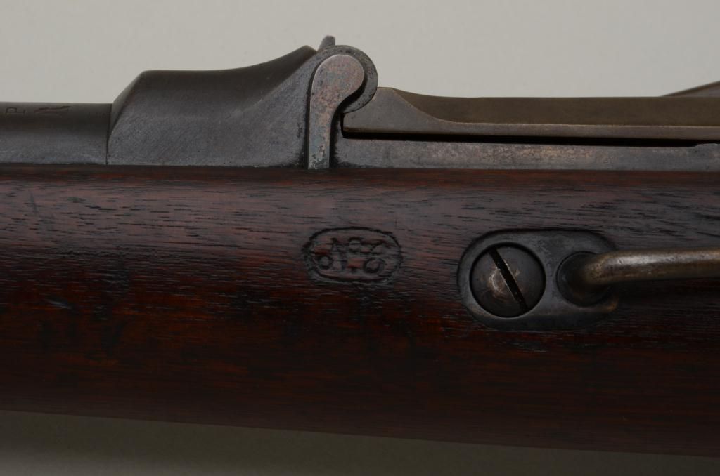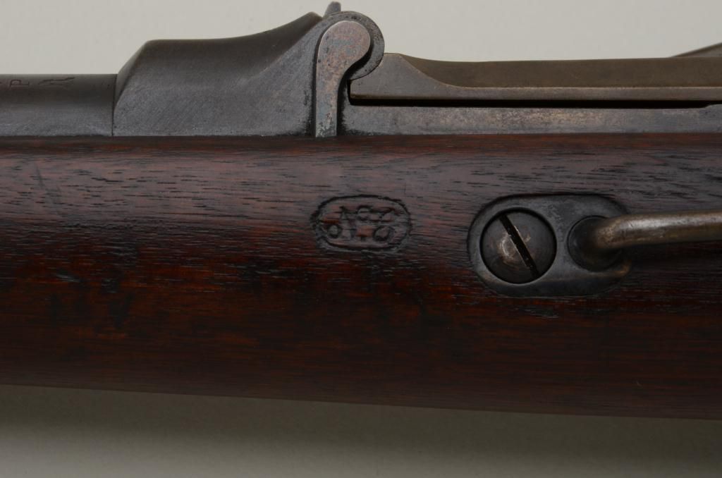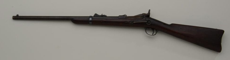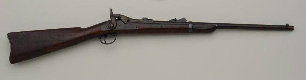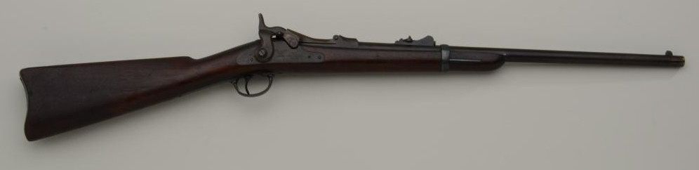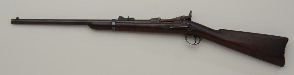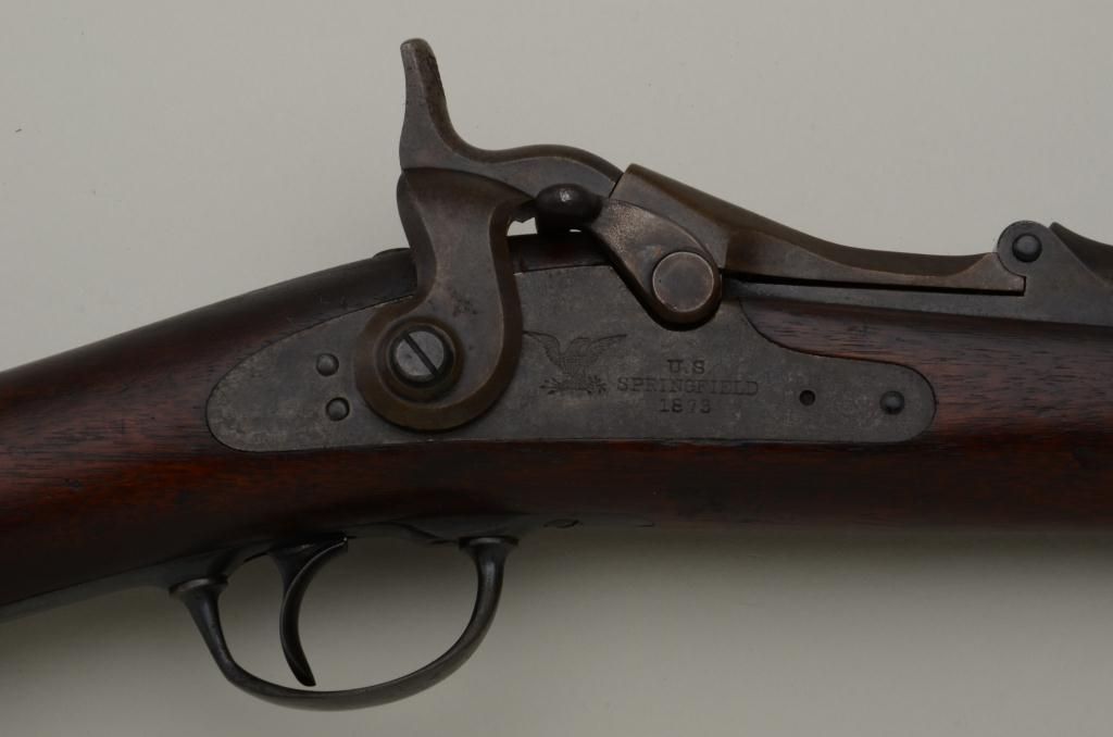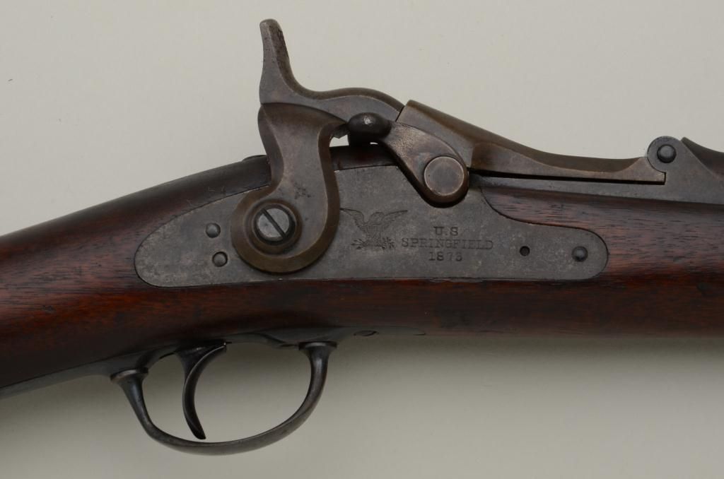 U.S. Springfield Model 1877 Trapdoor carbine, .45-70 cal., 22” barrel, blue and case hardened finish, wood stock, #88049. This gun is in overall very good condition showing an even plum brown patina on metal surfaceswith strong case colors on the underside of the “trapdoor” and within the interior of the receiver and traces of case color on the lock plate; fair bore, good markings, crisp action, very good wood stock with 2 visibleoval inspector cartouches on the left side of the stock and an “x” stamped behind the rear tang of the trigger guard. Est.: $700-$1,400.