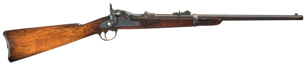 The correct Model 1879 pattern rear sight is marked with a "C" (carbine) on the left side, and the left side of the barrel is stamped with "V / P / eagle head / P" proof and inspection marks. Low arch breechblock marked "U.S. / MODEL / 1873" and the lock plate marked "U.S. / SPRINGFIELD " ahead of the eagle motif. "U.S." marked buttplate with cleaning rod compartment (rod not included). The oil finished walnut stock has the standard sling bar and ring on the left side. A very faint inspection mark is stamped on the left wrist, with a circled script "P" behind the trigger guard.