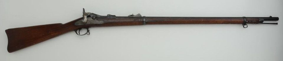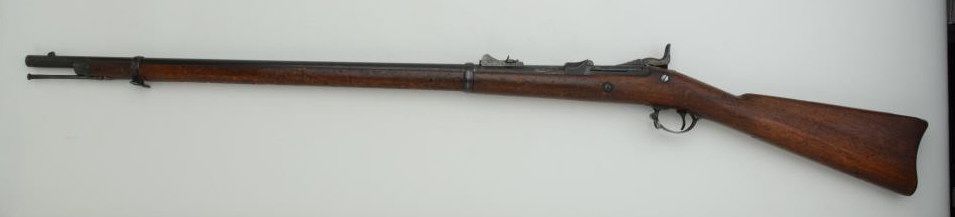 U.S. Springfield Model 1879 trapdoor rifle, .45-70 cal., 32-1/2” barrel, wood stock, #256672. This gun is in overall good condition with a heavy dark patina on metal surfaces, fair bore, good action, overallgood wood with scattered old nicks, mars and losses along the ramrod channel from use and storage; only cartouche is what appears to be a stylized “L” or “T” in an oval on top of the butt stock at the front of the butt plate top piece. From an old estate. Est.: $400-$800.