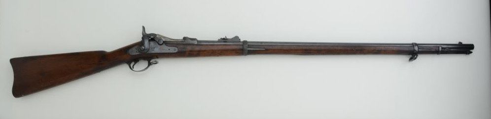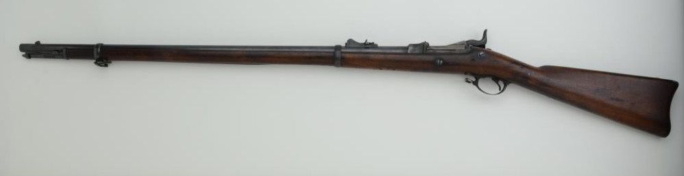 U.S. Springfield Model 1880 trapdoor rifle with triangular bayonet ramrod, .45-70 cal., 32-1/2” barrel, wood stock, #156946. This scarce variation is in overall good condition with a crisp action, good markings, bore may clean to good/very good; wood shows an old re-finish with scattered mars and some oil discolorations, faint outline of cartouche on left side of stock above trigger, “12” stamped into top of butt stock, possibly arack number; approx. 1,000 produced. From an old estate. Est.: $900-$1,800.