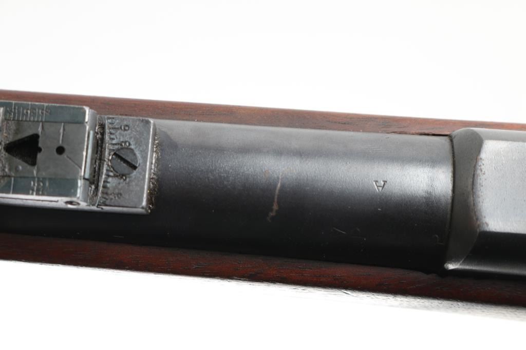 US military single shot rifle manufactured circa 1887. Features 29.5" barrel, blade front sight, rear sight with elevator ladder, sling swivels, stacking swivel, external hammer, straight gripped walnut stock, curved steel buttplate. Bore is good condition, showing good rifling. Most metal surfaces are a dull blue, with handling wear on the hammer, and trapdoor. (Barrel might be an old re-blue) Stock is good, appears to have been lightly sanded, and re-finished at some point, "46" is stamped at the heel, and a small "76" is stamped behind the lower tang, no cartouche visible.. Breech block is dated 1884. Barrel marked over chamber "V / P / (eagle head)", "P". Buttplate marked "US" on the tang. The U.S. markings on the lock plate have been scrubbed, and the cleaning rod is incorrect for this rifle. The first digit of the serial number is very faint, but believe it to be 6. Condition is NRA Good Antique Firearm.