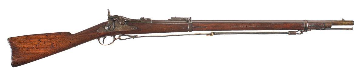 Second Type Trapdoor Model 1884 Cadet rifle produced from 1890 to 1893. The lock is undated and marked with the standard markings ahead of the hammer, and faint cartouche" on the left side of the wrist. The stock has been freshened. Complete with leather sling in good condition.