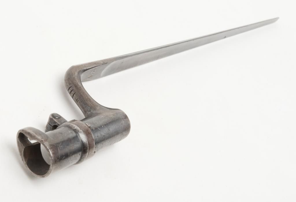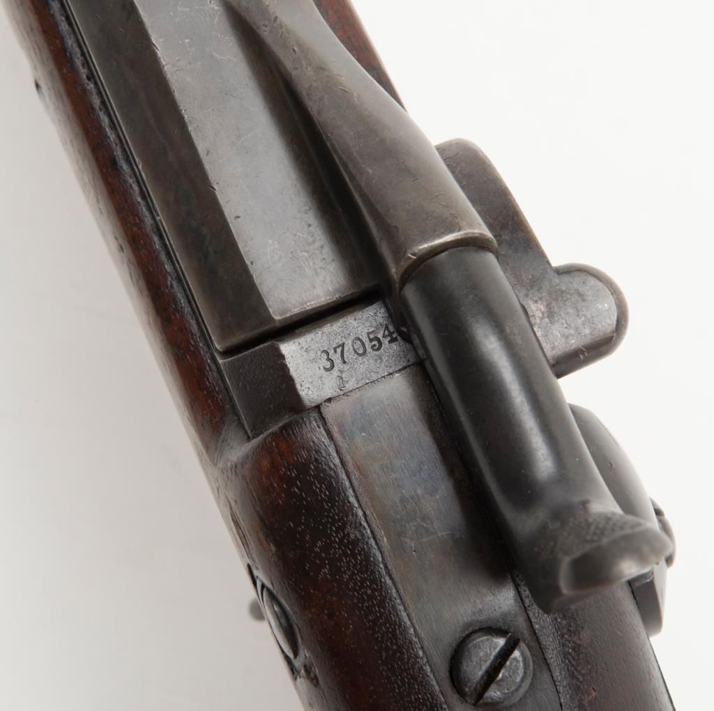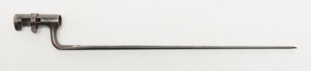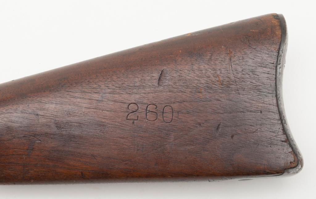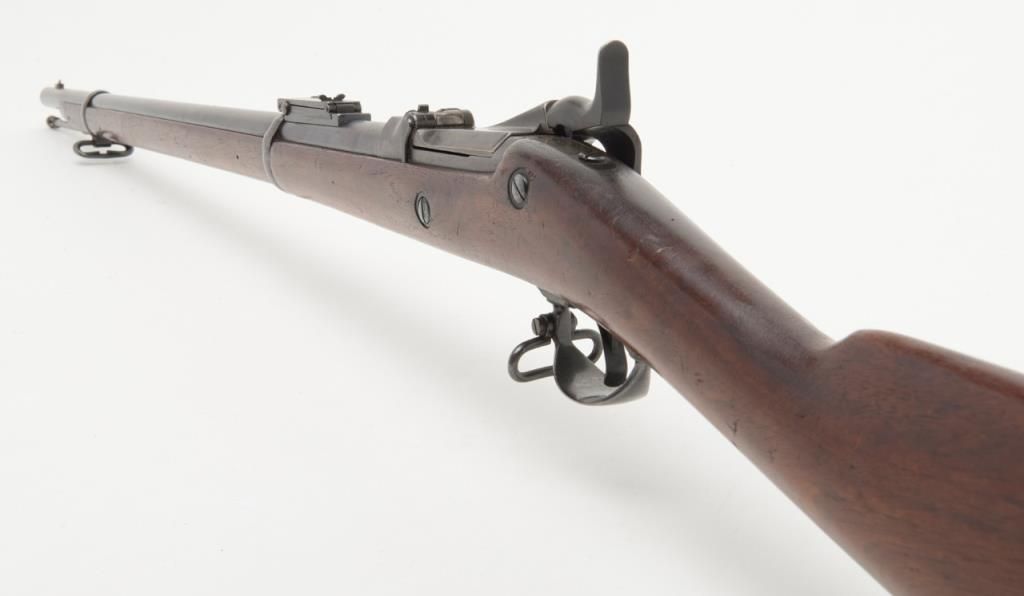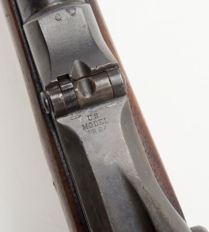 U.S. Springfield Model 1884 Trapdoor Cadet rifle with socket cadet length bayonet, .45-70 cal., 29-1/2” barrel, blue finish, wood stock, #370542 in overall very good to near fine condition showing the majority of its military blue finish,crisp action, sharp markings on the lock plate, very good + bore with very good to near fine wood stock displaying “260” stamped on the right side of the butt stock. The bayonet is in overall very good to near fine condition. A hard variation to locate in any condition and this is a beauty! (Antique). Est.: $1,000-$2,000.