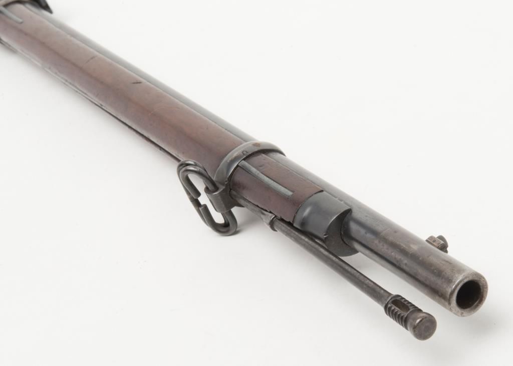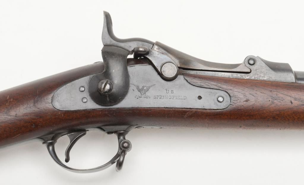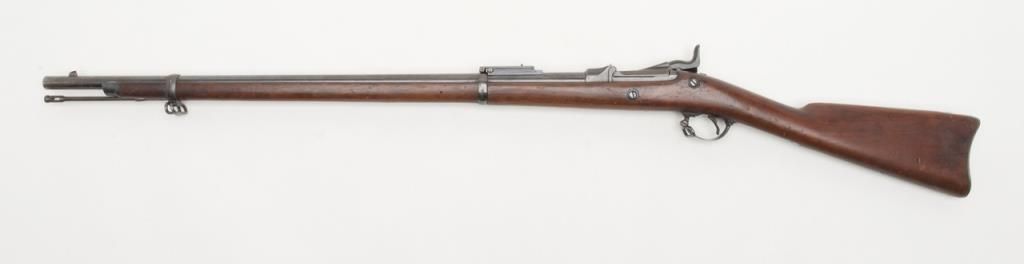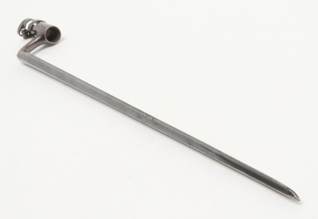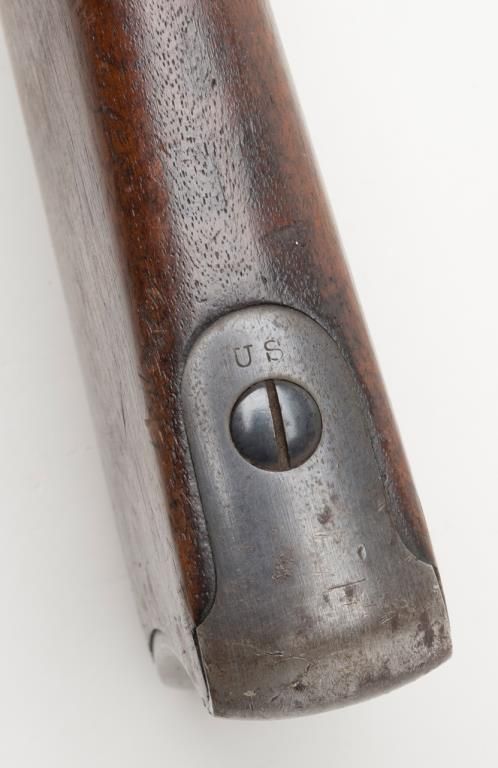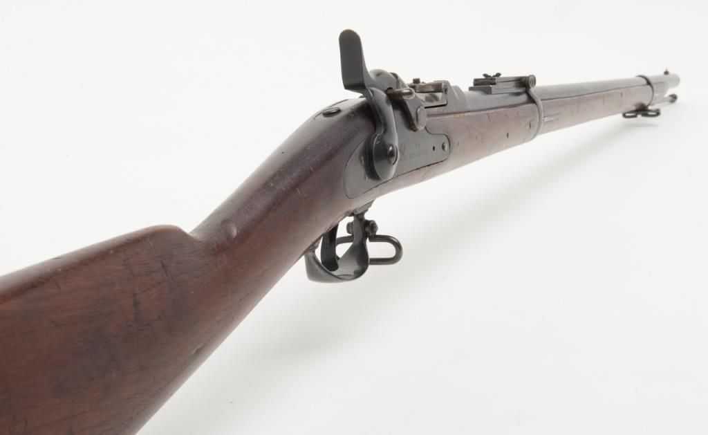 U.S. Springfield Model 1884 Trapdoor Cadet rifle with socket cadet length bayonet, .45-70 cal., 29-1/2” barrel, blue finish, wood stock, #370542 in overall very good to near fine condition showing the majority of its military blue finish,crisp action, sharp markings on the lock plate, very good + bore with very good to near fine wood stock displaying “260” stamped on the right side of the butt stock. The bayonet is in overall very good to near fine condition. A hard variation to locate in any condition and this is a beauty! (Antique). Est.: $1,000-$2,000.