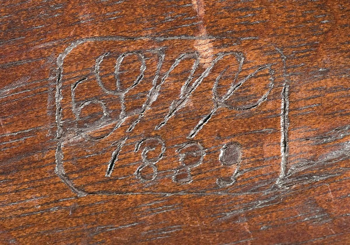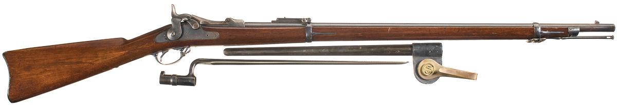 This is a late production U.S. Springfield Model 1884 Rifle that was manufactured in 1889. The rifle has a blued barrel, bands, lock plate, hammer, trigger guard and buttplate. The breech block and barrel tang have a color casehardened finish. The stock is black walnut with an oil finish. The rifle has the Buffington rear sight that is adjustable for windage and elevation, 'low arch' breechblock, three-click tumbler and grooved trigger. The lock plate is stamped with the Eagle and shield motif followed by "U.S./SPRINGFIELD" in two lines. The top of the breechblock is marked: "U.S./MODEL/1884" in three lines. The left side of the barrel is stamped with the Ordnance "V/P/ Eagle Head/P" proof and inspection marks just ahead of the receiver. The leaf of the Buffington rear sight is stamped with an "R" (rifle). "G/U.S." is stamped on the heel of the buttplate. The left side of the stock wrist is stamped with the Ordnance final inspection mark that consists of the script initials "SWP" over the date "1889" in a rectangle with flattened corners. An encircled, script, "P" proofmark is stamped on the underside of the stock behind the trigger guard finial. The socket bayonet has a 18-inch angular blade that is stamped "U. S." in front of the shank. The bayonet is complete with a regulation scabbard with blued body, black leather hanger and cast brass hook.