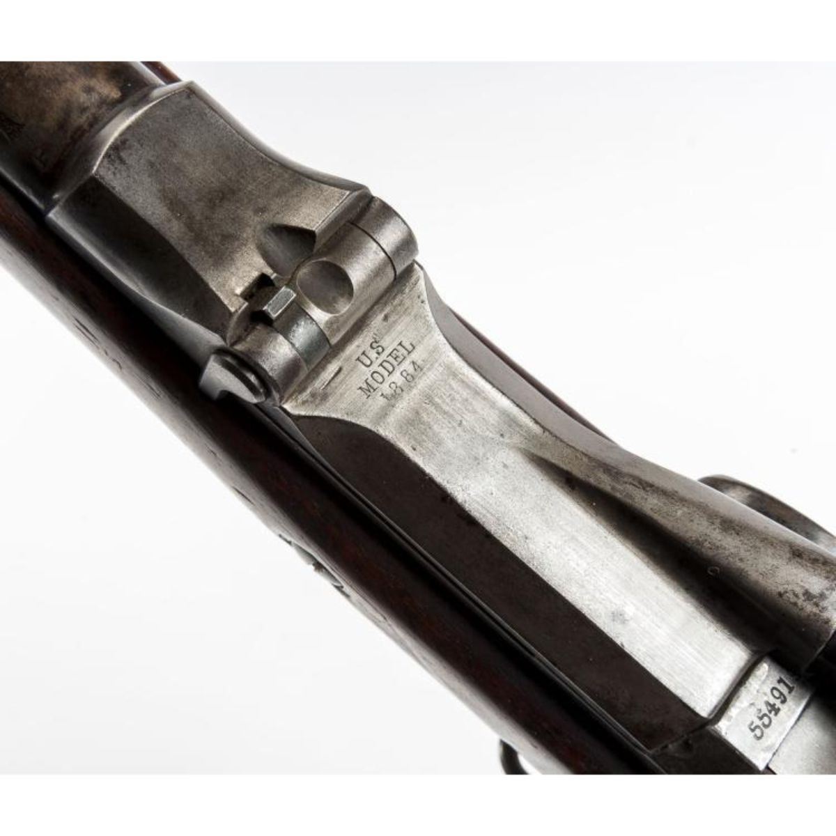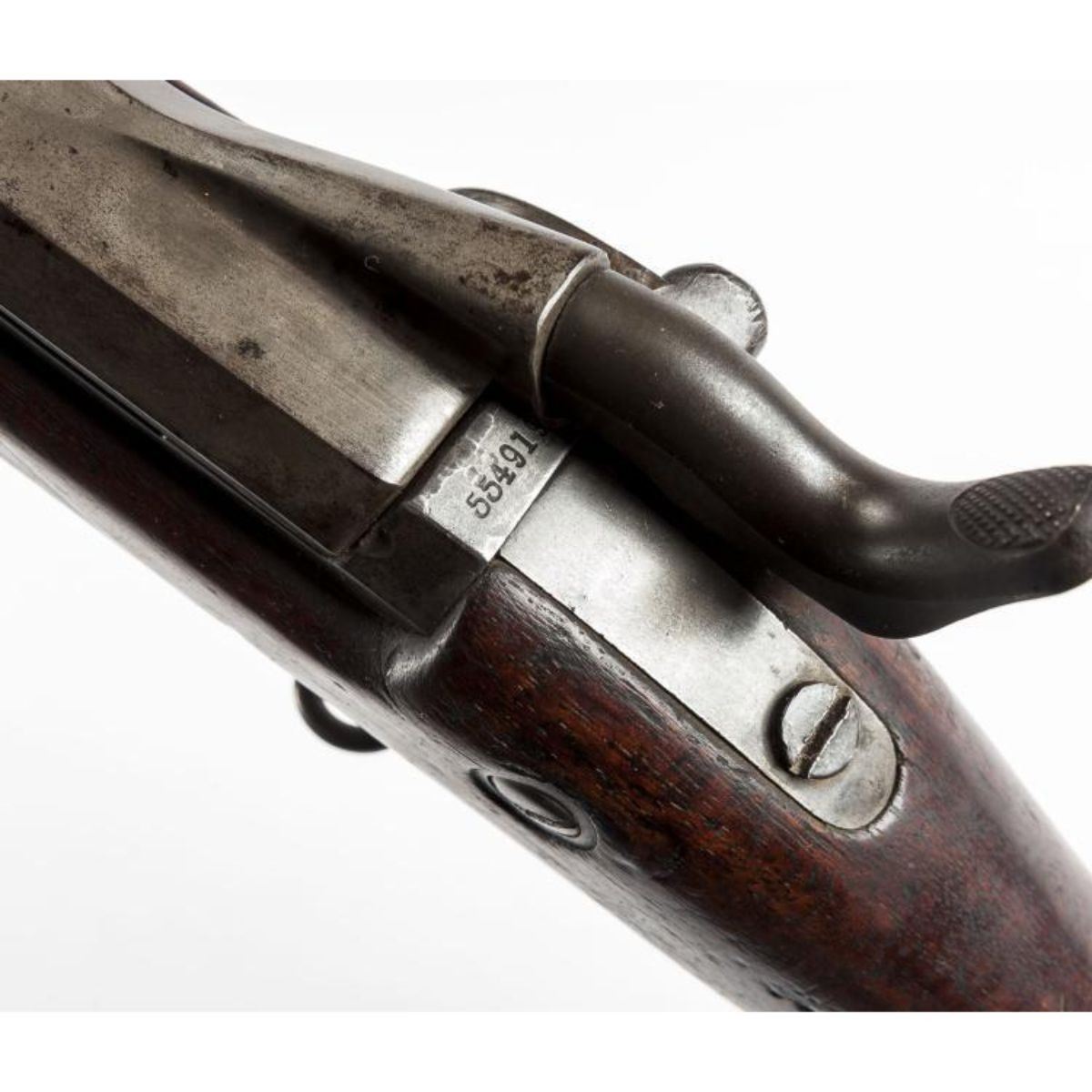 SERIAL NUMBER: 554919 DESIGN: Single-shot trap door percussion rifle. 31" barrel. MATERIAL/FINISH COMPOSITION: Blued steel. Wood stock. FEATURES: Rear sight. Sling rings. Includes ramrod. Carved "SWP 1891" to stock. CONDITION: Good. Approximately 30% of finish remains. Scratches and nicks to stock.