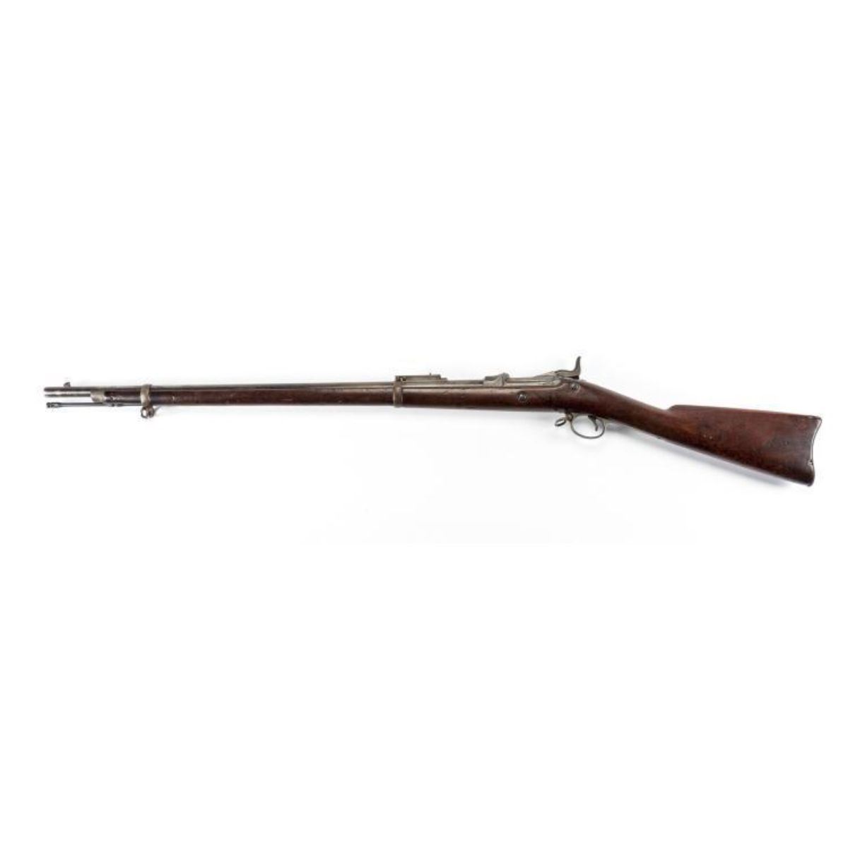 SERIAL NUMBER: 554919 DESIGN: Single-shot trap door percussion rifle. 31" barrel. MATERIAL/FINISH COMPOSITION: Blued steel. Wood stock. FEATURES: Rear sight. Sling rings. Includes ramrod. Carved "SWP 1891" to stock. CONDITION: Good. Approximately 30% of finish remains. Scratches and nicks to stock.
