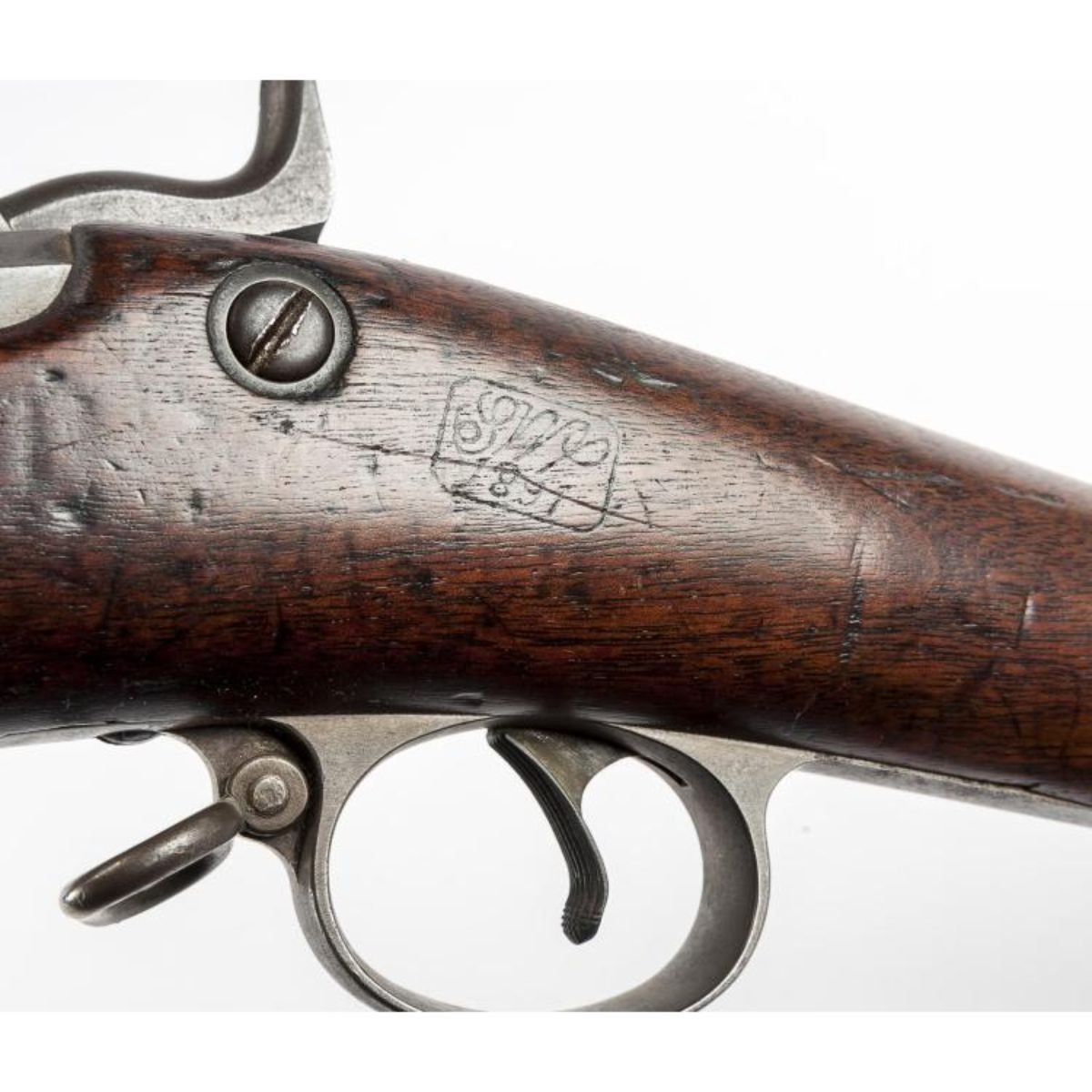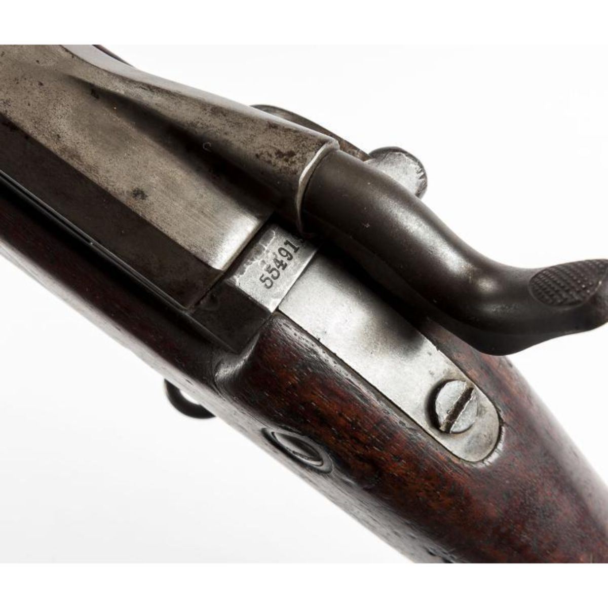 ingle-shot trap door percussion rifle. 31" blued steel barrel & wood stock. Rear sight, sling rings, includes ramrod. Carved "SWP 1891" to stock. SERIAL NUMBER: 554919. *Â good condition. Approximately 30% of finish remains. Scratches & nicks to stock.