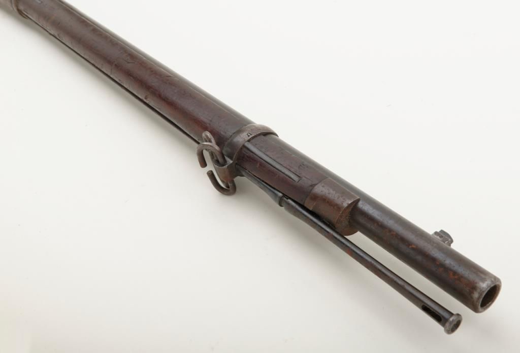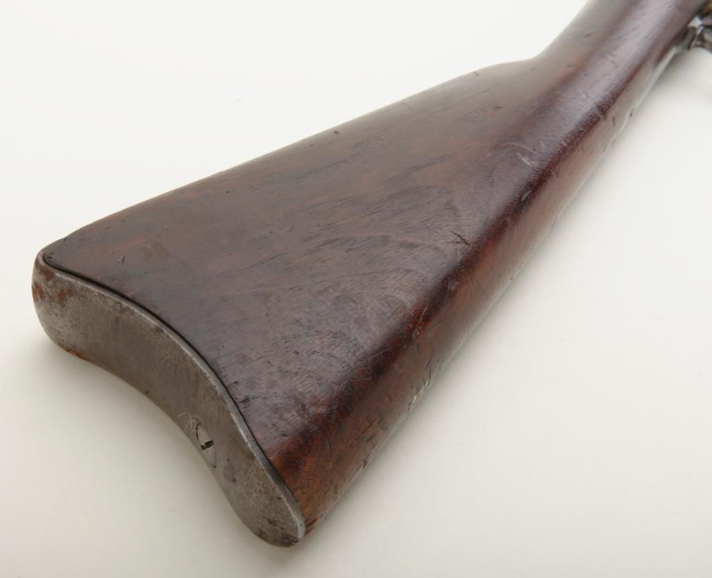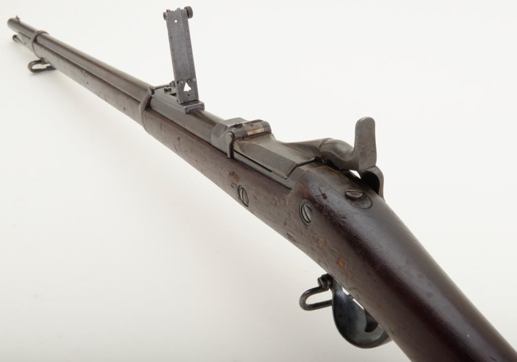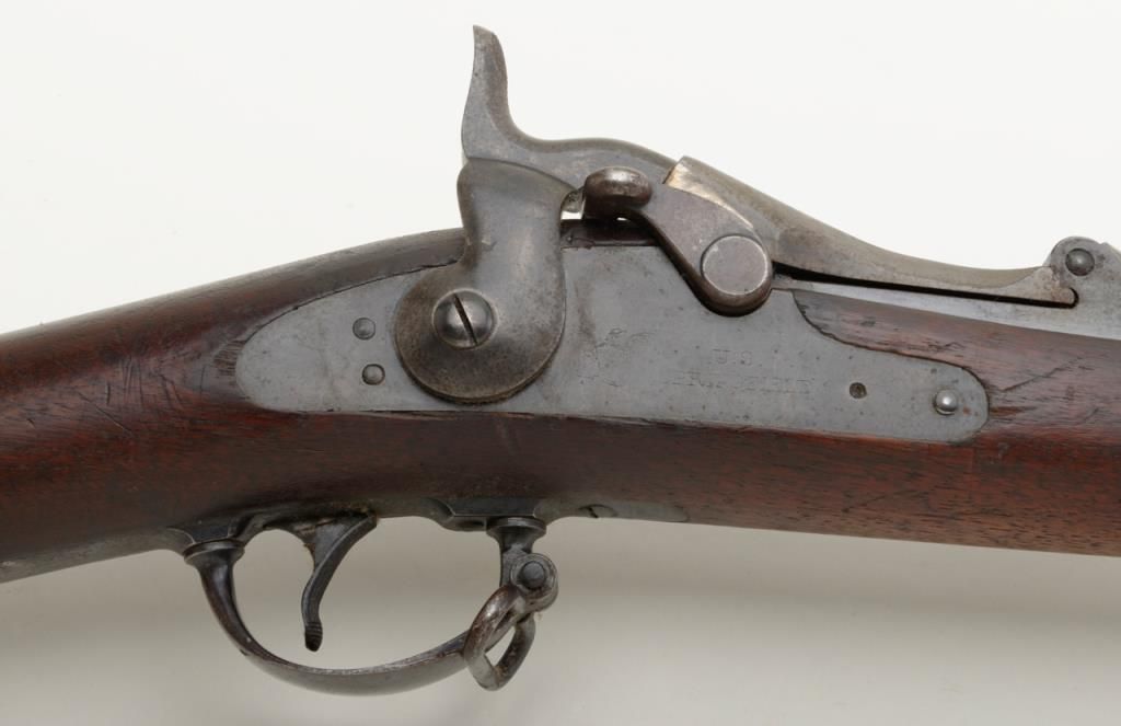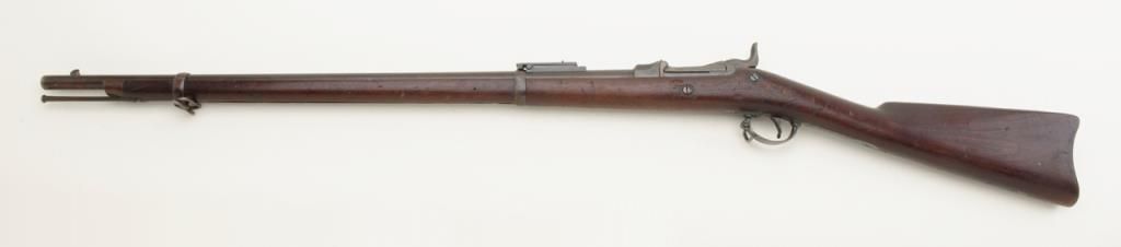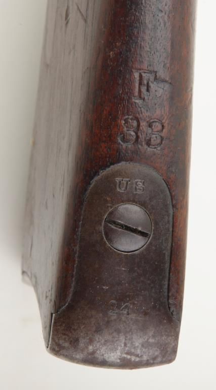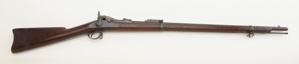 U.S. Springfield Model 1884 Trapdoor rifle, .45-70 cal., 29-1/2” barrel, blue and case hardened finish, wood stock, #279106 in overall un-cleaned good condition showing a dark plum patina with traces of case color on trapdoor and rear tang; good bore, crisp action, top of receiver marked “M 29”; good wood with scattered mars and dings from carry and storage; “F 33” stamped on top of comb, “15” painted in white on bottom of butt stock, “24” stamped into top of butt plate. From an old estate. (Antique). Est.: $250-$500.