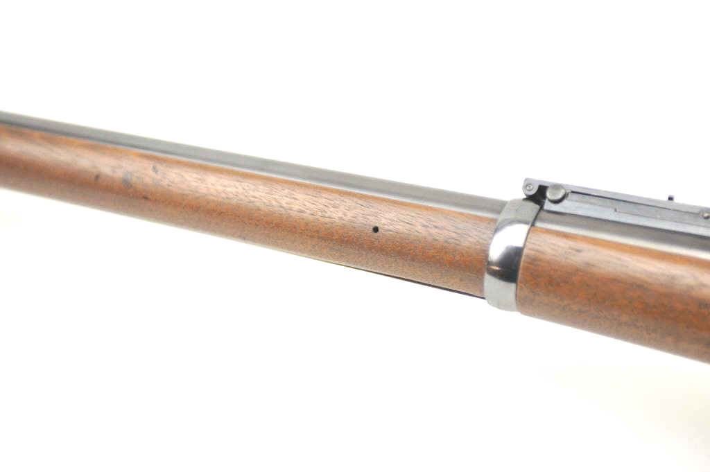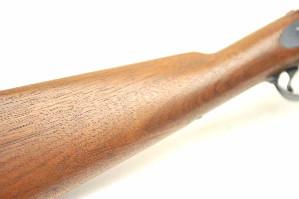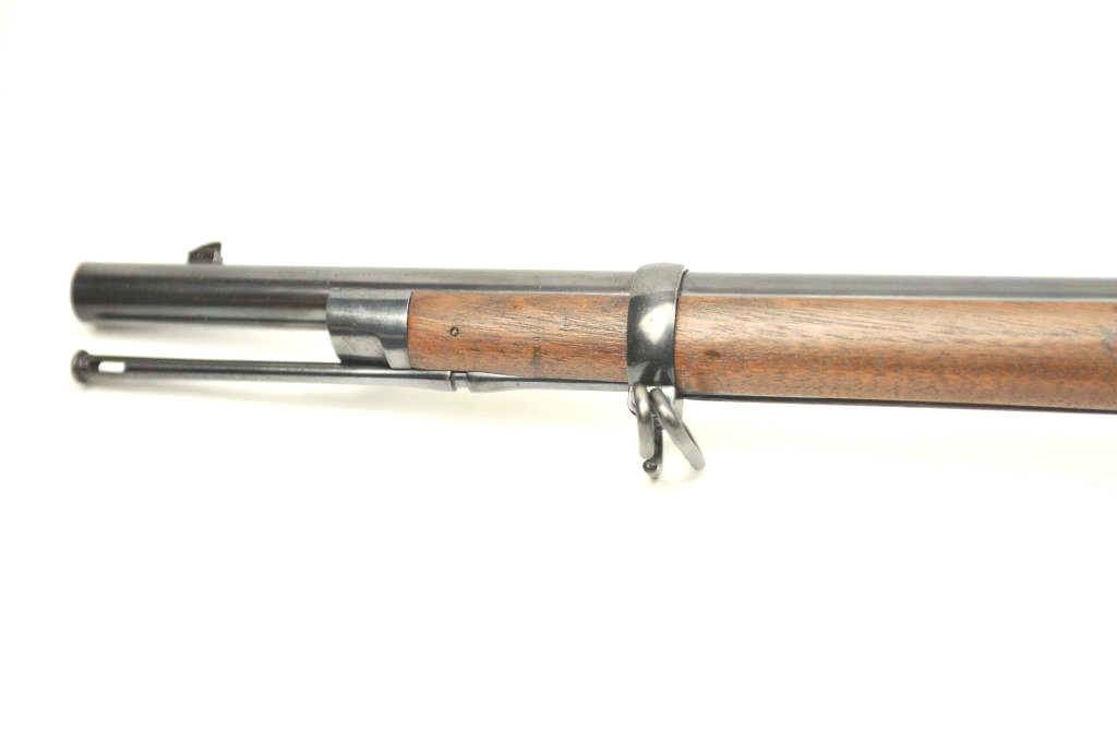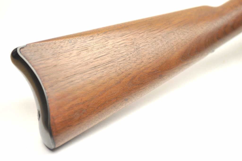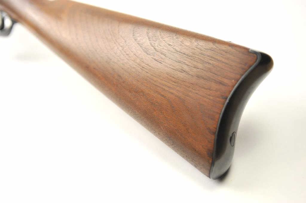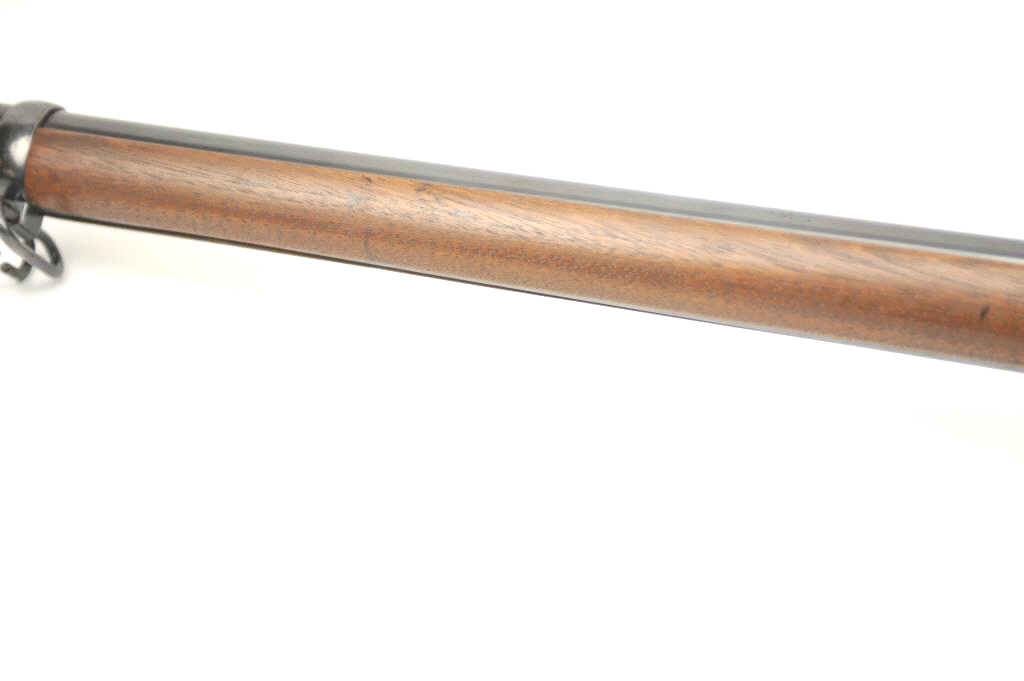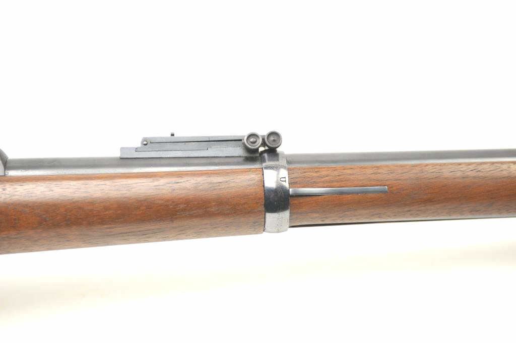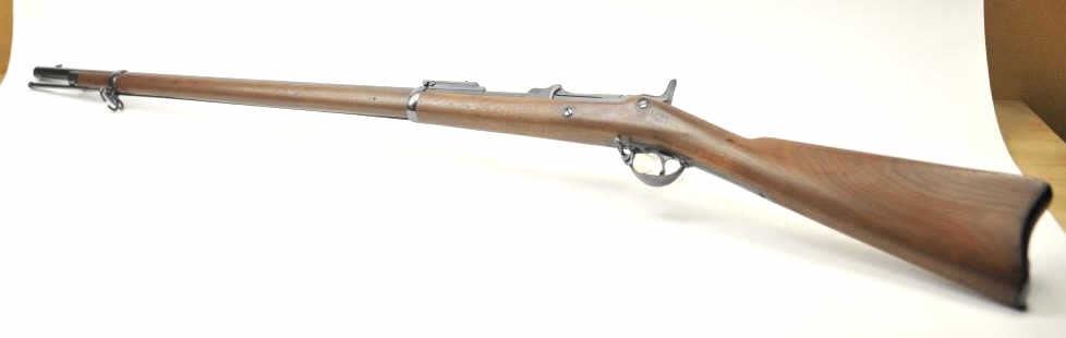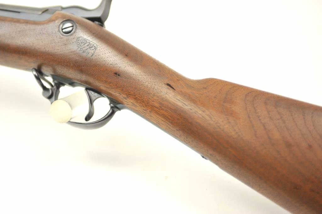 U.S. Springfield Model 1884 trapdoor rifle, .45-70 caliber, Serial #478344. The rifle is in excellent to near mint overall condition with a 32” barrel with a ramped blade front and military tangent style rear sights. Therifle has barrels band swivels and a correct ram rod. The metal surfaces retain nearly all of the original blue finish with vivid case coloring on the breech block. The barrel has various proofs and acceptancemarks at the breech and a sharp eagle on the side plate. The smooth wood stock is in excellent condition with a crisp cartouche dated 1889 at the left wrist and a Circle P behind the trigger guard. The butt stockends with a smooth, steel crescent butt plate. The bore is bright, the action is crisp and the markings are very sharp. It would be difficult to improve on this impressive trapdoor. Est.: $1,750-$3,500.(Antique).