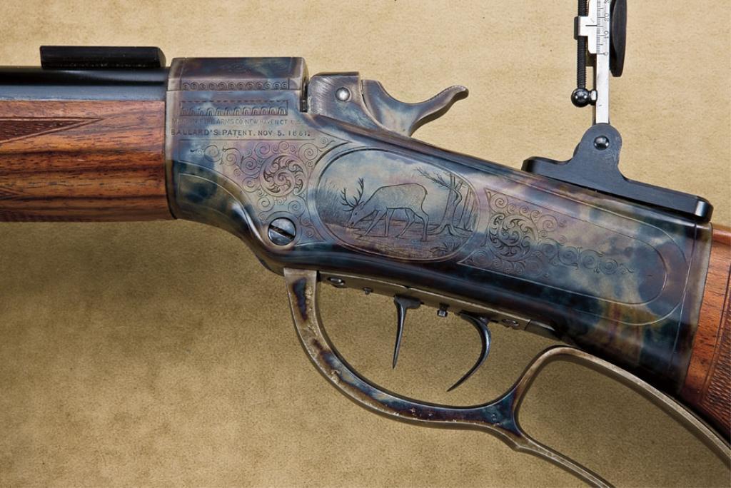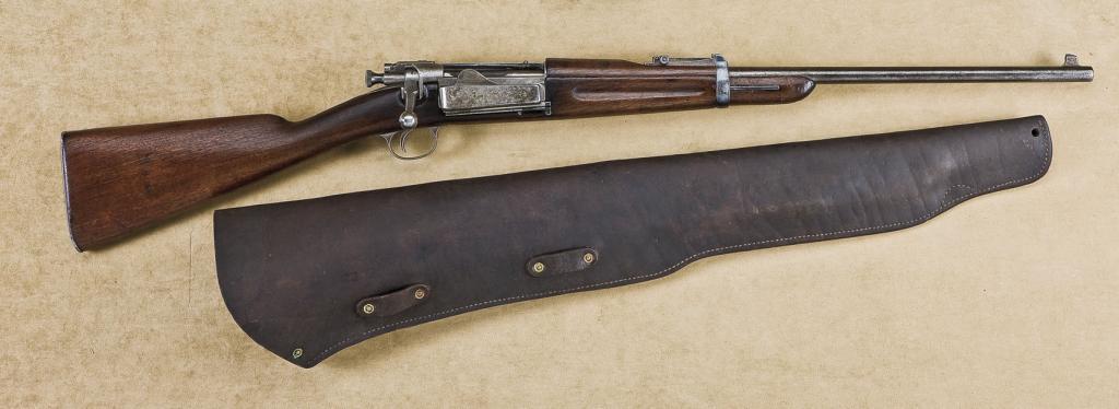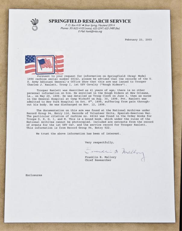 U.S. Springfield Model 1896 Krag carbine, 30-40 Krag cal., 22” round barrel, wood half stock, #68342. Original letter from Springfield Research Service, signed by Franklin B. Mallory, indicates “ . . .Krag Model 1896 carbine serial number 68342, please be advised that the records of the U.S. Army Adjutant General’s Office show that this arm was issued to Trooper Charles J. Ranlett, Troop I, 1st USV Cavalry (‘Rough Riders’)”. Also included are copies of Trooper Ranlett’s service records from the National Archives. The gun itself is in overall good to very good condition showing a plum brown patina to the barrel and light patina to the receiver with some silvery case to the receiver magazine and traces of original fiery blue on the top flat of the bolt assembly. The wood is in overall good + condition with scattered nicks, mars and scratches from carry and storage and the circle “P” inspector’s mark is clearly present behind the trigger guard and the 1896 dated cartouche is also present on the left side of the stock at the wrist behind the saddle ring and bar that is also present; accompanied by a US marked thick leather scabbard in overall good condition. An early Krag with assignment records to a trooper in the famous Rough Riders. From the Richard Wolfe Collection. Est.: $3,000-$6,000.