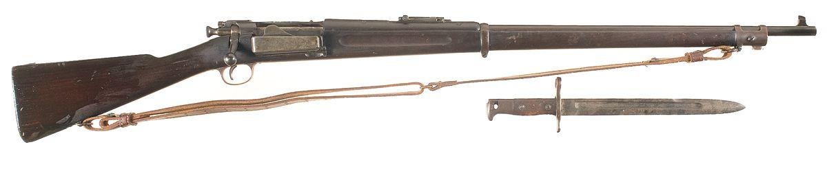 Blade and ladder sights, standard receiver markings, smooth stock and brown commercial leather sling. With a 1901 dated U.S. 11 3/4" bayonet, missing some mounting hardware.