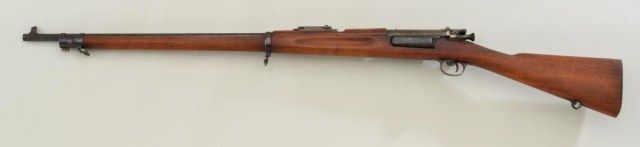 U.S. Springfield Model 1898 Krag bolt-action rifle, .30-40 Krag cal., 30” barrel, blue finish, wood stock, #303945. This gun is in overall very good uncleaned condition showing considerable muted blue finish, good bore,crisp action, good markings and overall very good wood with circle P proof behind the trigger guard and 4 b next to the circle P; no other visible cartouches. Est.: $400-$800.