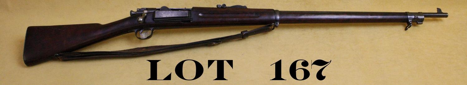 U.S. Springfield Model 1898 bolt-action military rifle, 30-40 Krag cal., 30” round barrel, military blue finish, wood stock, old leather sling, cleaning rod in butt trap, #201302. This gun is in overall goodcondition showing considerable muted military re-finish remaining on metal surfaces, fair bore, good action and markings; wood is overall good with circle “P” proof behind trigger guard and faint trace of aninspector’s cartouche on the left side of the stock above the trigger guard. Est.: $300-$500.
