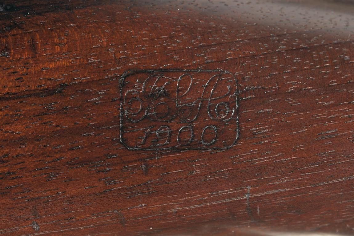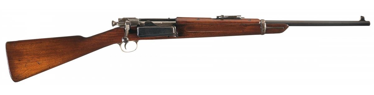 Serial number correctly falls into the carbine serial number range (222,609-362,256). The tangent rear sight is graduated from 1 to 20 with the base graduated 1 to 4. The left side of the receiver is marked "U.S./MODEL 1899. SPRINGFIELD ARMORY 282415." Mounted with a straight grip half stock with hand guard and steel buttplate with compartment containing an oiler. The left side of the stock has a "JSA/1900" cartouche with a circled script "P" on the underside of the wrist.
