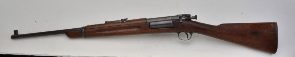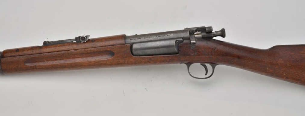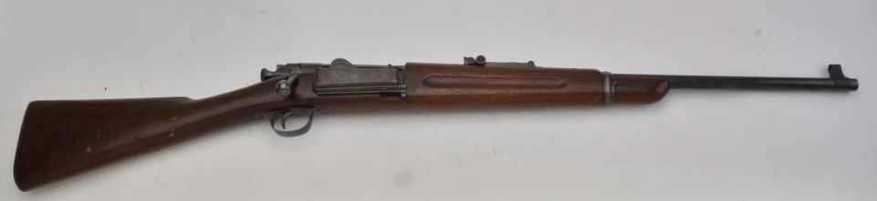 U.S. Springfield Model 1899 Krag bolt action carbine, .30-40 Krag cal., 22” barrel, military finish, wood stock, #226723. This gun is in overall very good condition showing plum brown patina on barrel and traces ofcase color on receiver with balance a silvery tone; only fair bore, crisp action, good markings and very good wood stock with scattered nicks and mars, circle P proof and JSA/1899 cartouche on left side of stockabove trigger. From an old estate. Est.: $750-$1,500.