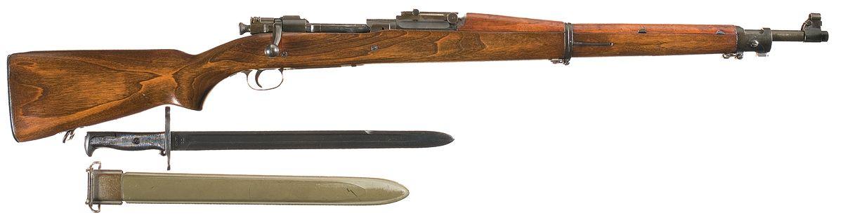 Hooded blade and ladder sights, with "5-37" dated Springfield barrel, standard receiver markings and a repaired stock. With a "SA/ 1906" bayonet and sheath.