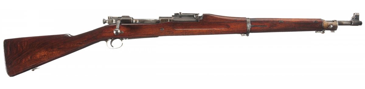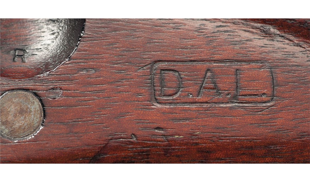 Early post-WWI rifle with double heat treated receiver, fitted with blade front sight and folding ladder rear sight. Springfield barrel dated "8-18/A" and the receiver ring marked "U.S./SPRINGFIELD/ARMORY/MODEL 1903." over the serial number. The bolt handle has the "straight drop" profile of the low number production, numbered "1 8" on the body. Straight wrist finger groove stock, with dual reinforcement bolts, a circled, un-serifed "P" behind the triggerguard, an early Springfield "D.A.L." cartouche on the left, and a smooth buttplate.