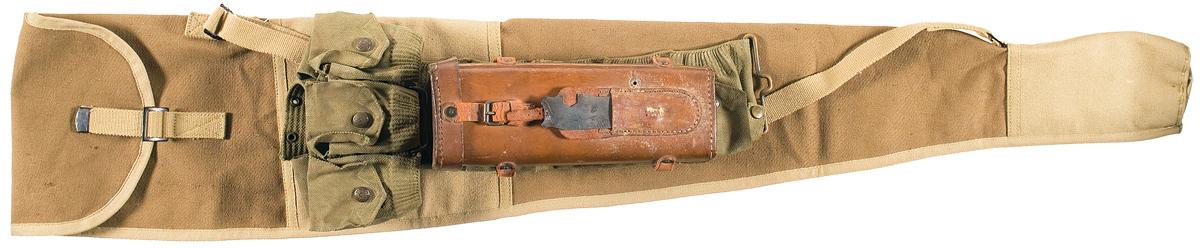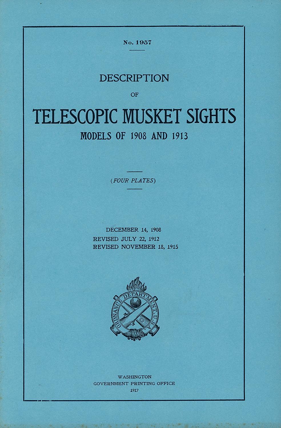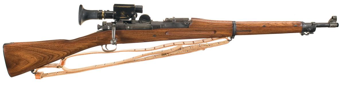 Hooded blade and ladder sights, with "SA/ 12-17" dated barrel the typical WWI production features which include a Type "S" stock with grasping grooves, two reinforcing bolts and smooth buttplate. Standard receiver markings, with a "R" marked cocking piece. Stock is equipped with a brown leather sling and a flat buttplate with storage compartment door. A scope rail is mounted to the left side of the receiver with 2 screws, and carrying a Warner & Swasey Model 1913 Telescopic Musket Sight, 5.2x power with a brass body, black lacquer finish, adjustable base and rubber eyecup, marked "TELESCOPIC MUSKET SIGHT/ MODEL OF 1913 No. 422/ THE WARNER & SWASEY CO./ CLEVELAND OHIO, U.S.A/ PAT. FEB.13-06. MAY 22-06.DEC.15-08.". The Springfield Model 1903 rifles equipped with 1908 and 1913 W-S Telescopic Sights were the first sniper rifles issued by the U.S. Army. The Army purchased 5,041 W-S Telescopic Sights and many W-S Sniper Rifles were issued to the American Expeditionary Force in France during WWI. With a russet leather scope case, multi-tool, green canvas cartridge belt and 1917 dated manual.