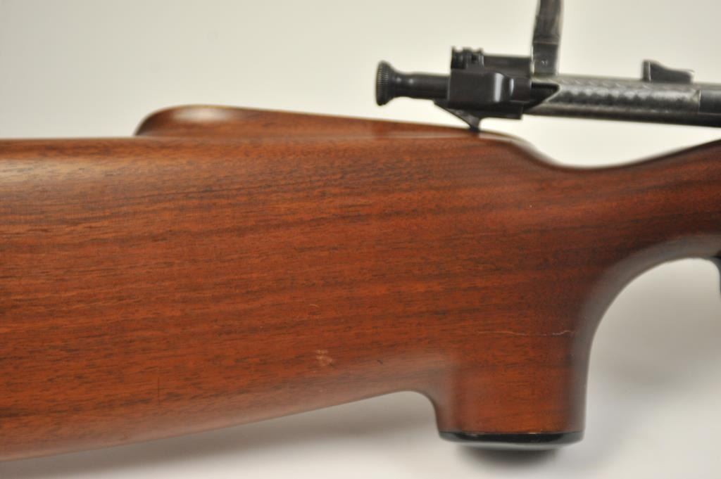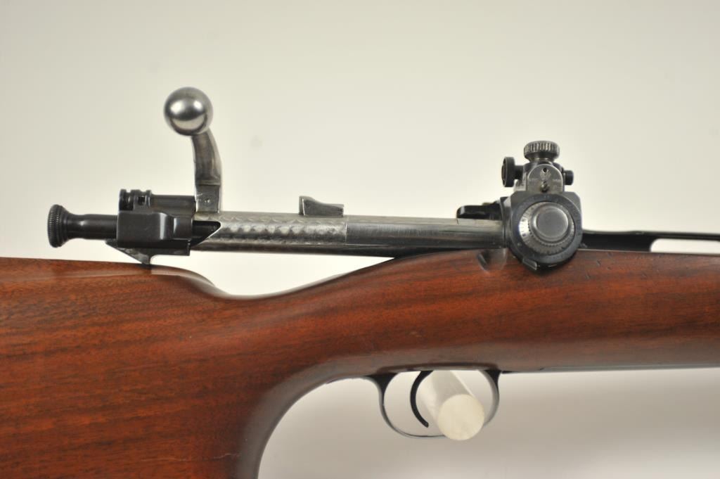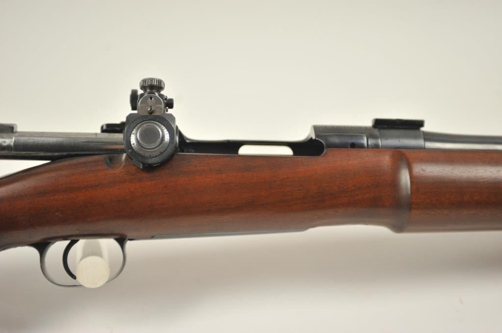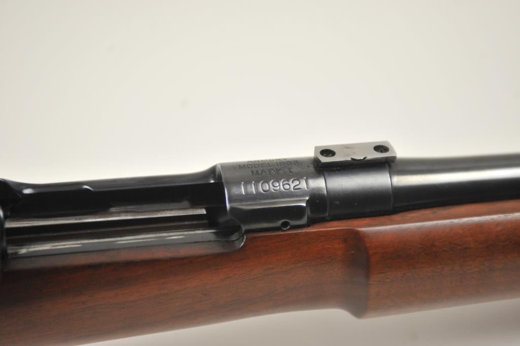 U.S. Springfield Model 1903 MK. I custom bolt action target rifle, .30-06 caliber, Serial #1109621. The rifle is in fine overall condition with a 24” barrel with a hooded globe style front sight, scope blocks and aVaver Corp. aperture sight at the rear, with a jeweled bolt. The rifle retains most of an old high quality re-blue with the barrel marked, SA and dated 8-42 with the flaming bomb. The smooth wood target stock is invery good condition with a beavertail fore end, pistol grip and solid rubber butt pad. The bore is good and the action works well. Est.: $400-$800. (C+R).