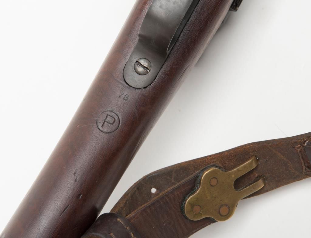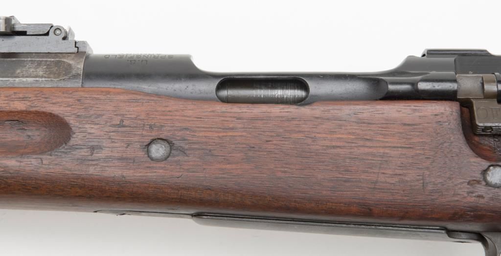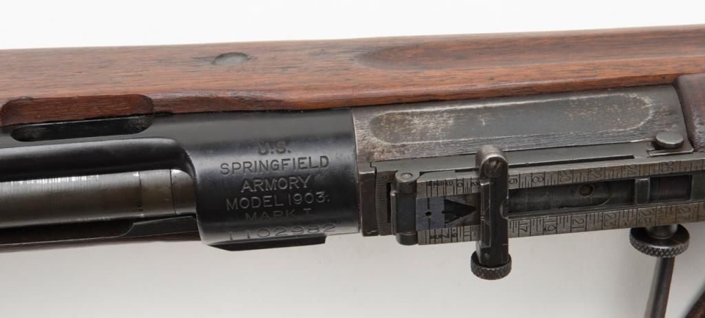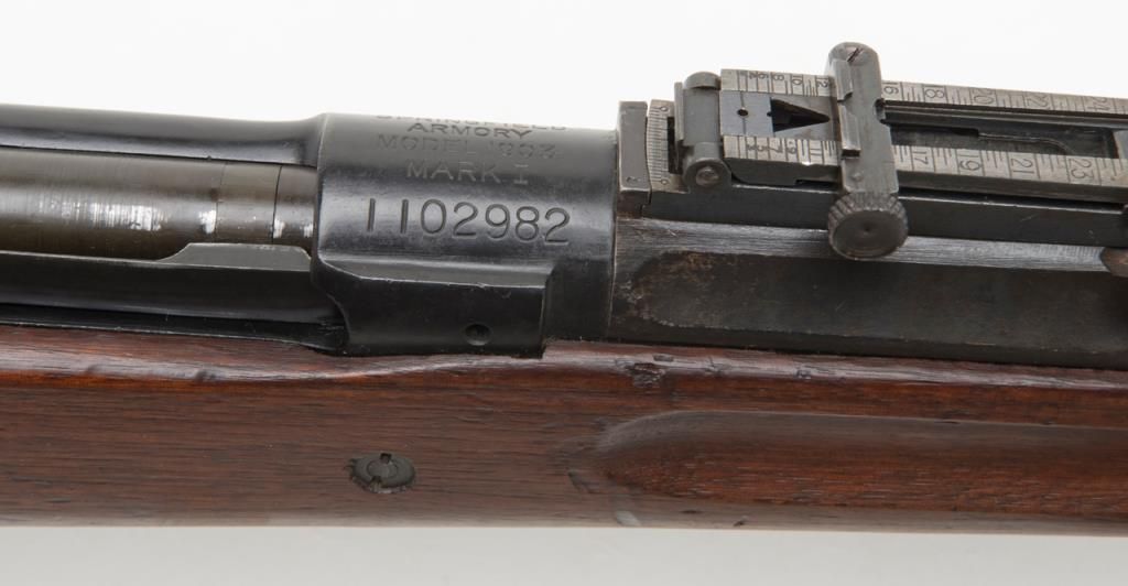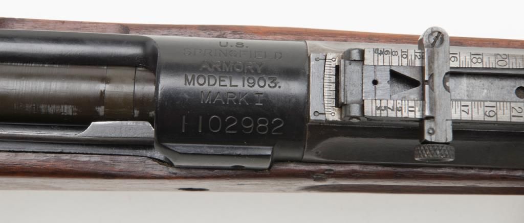 U.S. Springfield Model 1903 Mark I bolt action rifle, set up for the Pederson device, .30-06 cal., military finish, wood stock, #1102982 in overall good condition. (C&R/PPT). Est.: $400-$800.