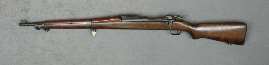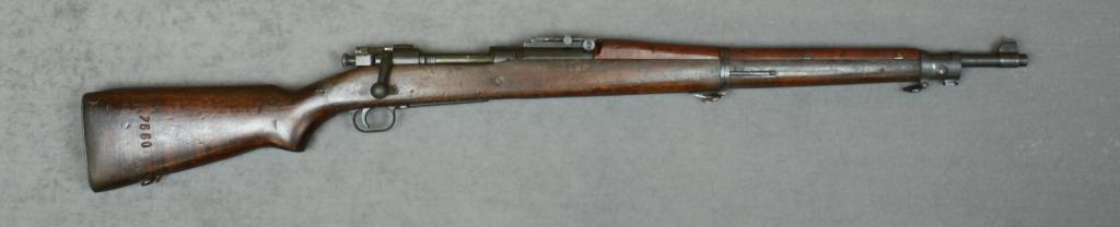 U.S. Springfield Model 1903 bolt-action  military rifle, .30-06 cal., 24” barrel dated  6-44 with H.S. and flaming bomb proofs,  sling swivels, wood stock, #1357660. This gun  is in overall good condition showing a darkpatina on metal surfaces, fair bore, good  action, markings and wood showing wear,  nicks, mars and scratches and a number  stamped on the right side of the butt stock,  “7660”.  Est.:  $175-$350.