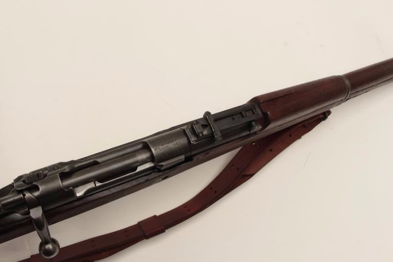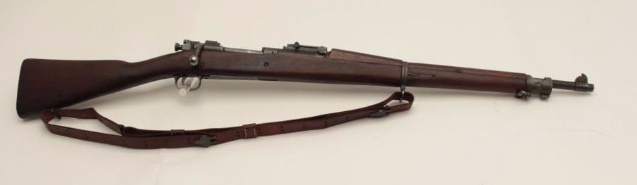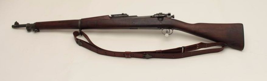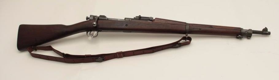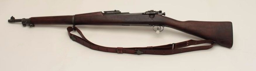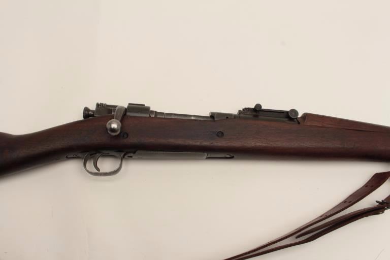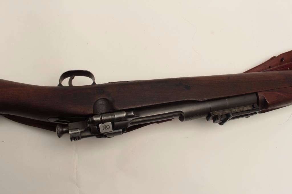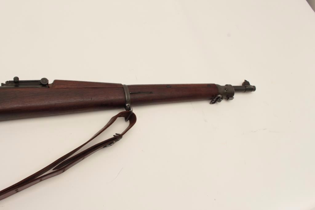 U.S. Springfield Model 1903 bolt action military rifle, .30-06 caliber, 24” H.S.-marked barrel dated 9-44, re-worked for WW II service, military finish, wood stock, leather sling, S/N 491699, in overall verygood condition showing the majority of its military finish, very good bore, crisp action and markings, very good stock with P stamp behind trigger guard (and on floor plate). (C&R/No PPT). Est.: $350-$700.