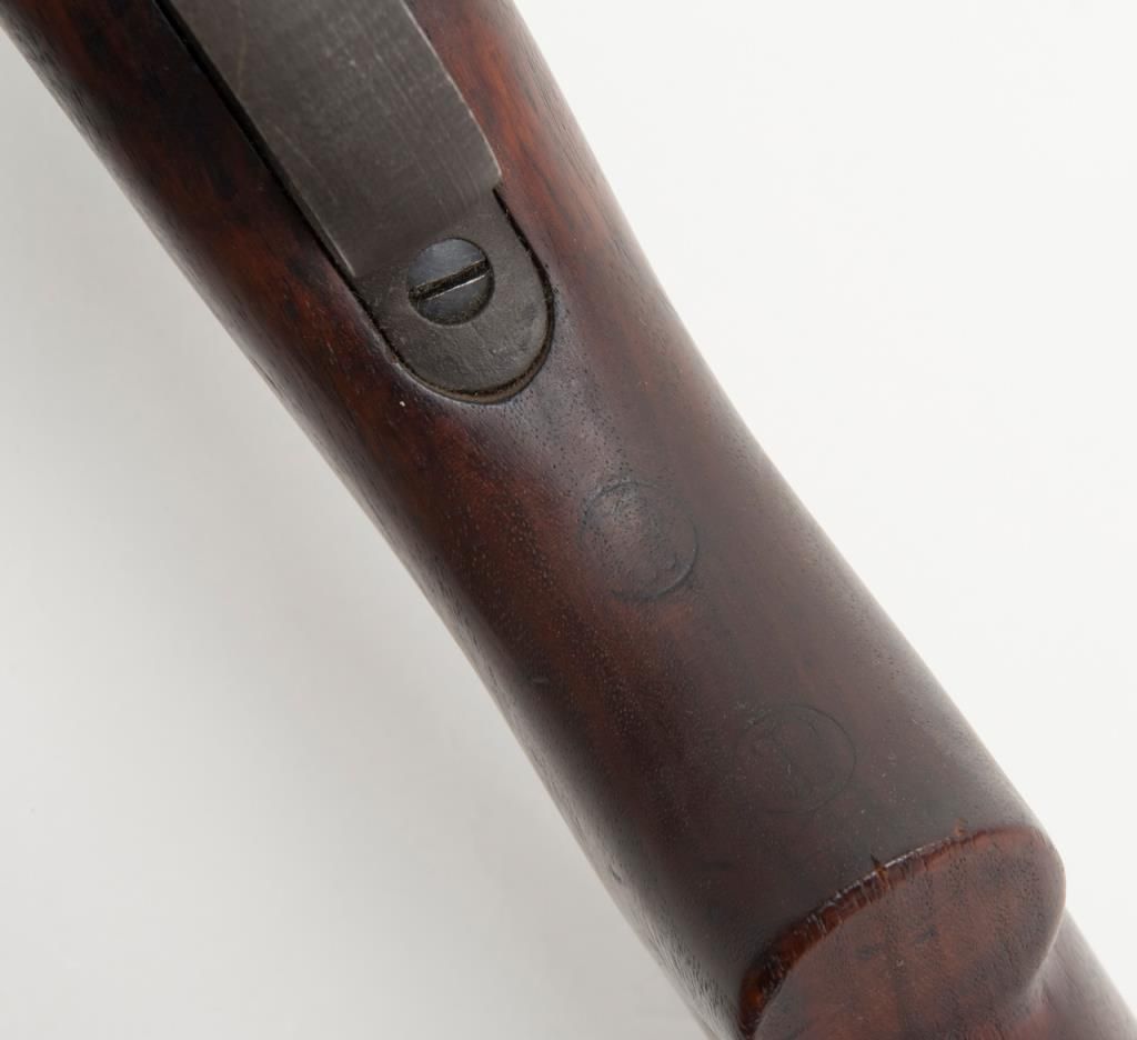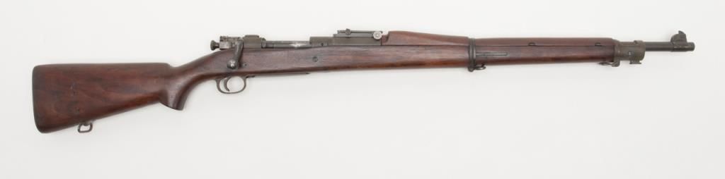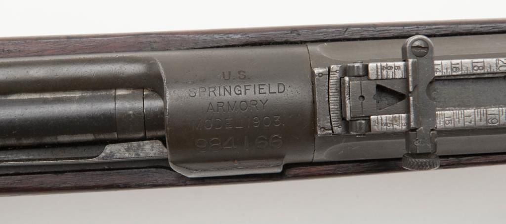 U.S. Springfield Model 1903 bolt action rifle, .30-06 cal., 24” S.A. barrel dated 12-41, military finish, wood stock, #984166 in overall very good + condition showing the majority of its military finish, very good bore, crisp action, sharpmarkings, very good wood with some scattered old mars and scratches, two circle “P” proofs, “AAS” cartouche on left side of stock above the trigger guard and “D1836” stamped on the underside of the stock in front of the rear sling swivel.(C&R/PPT). Est.: $400-$800.