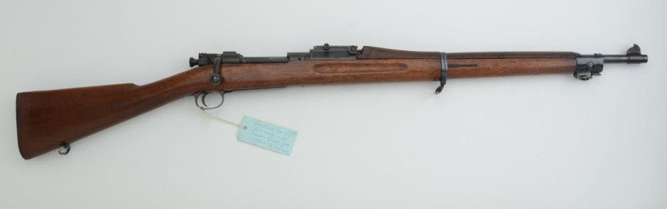 U.S. Springfield Model 1903 bolt action rifle, .30-06 cal., 24” S.A. barrel dated 3-18, wood stock, #746072. This gun is in overall good condition with considerable military finish remaining, good bore, action, markings and wood; H.E. cartouche on left side of stock above trigger. From an old estate. Est.: $300-$600.