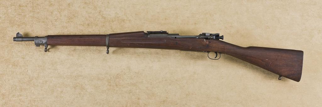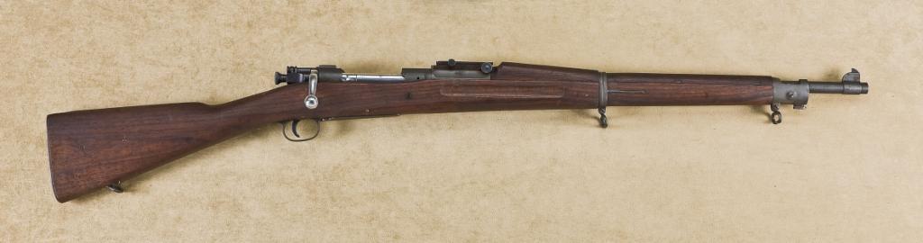 U.S. Springfield Model 1903 bolt action rifle, 30-06 cal., 24” round star gauge marked Nation Match barrel, Parkerized finish, wood stock, #809047. This rifle is in overall very good to excellent condition showing approx. 95% military finish, very good to excellent bore, crisp action, sharp markings, bolt is etched with the serial number of this gun; barrel dated 10-28 with flaming bomb and “RA” marking; stock is in overall very good to fine condition with several dings and mars from storage; circle P inspection behind the trigger guard; “DAL” in rectangle stamp on left side of frame above the trigger assembly; checkered steel butt with stippling and compartment for cleaning kit. Est.: $750-$1,500.