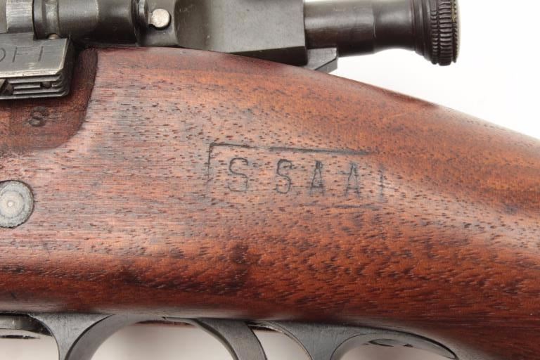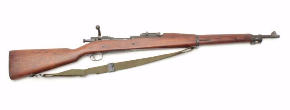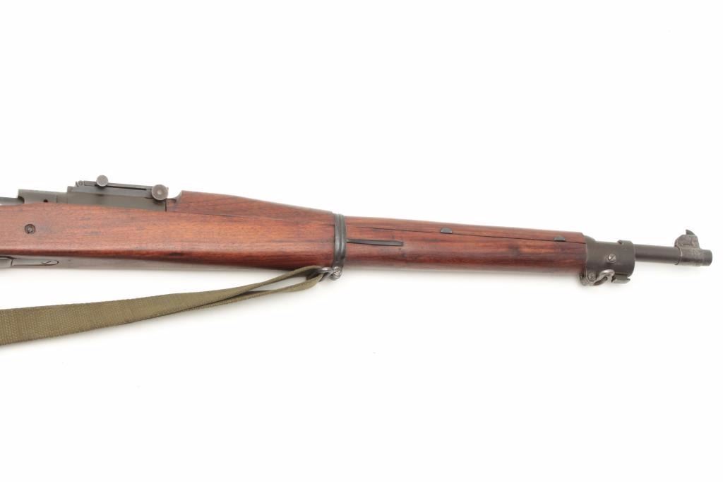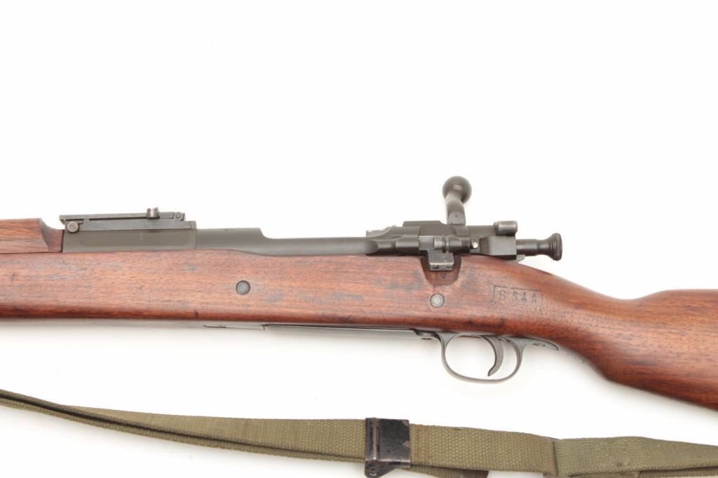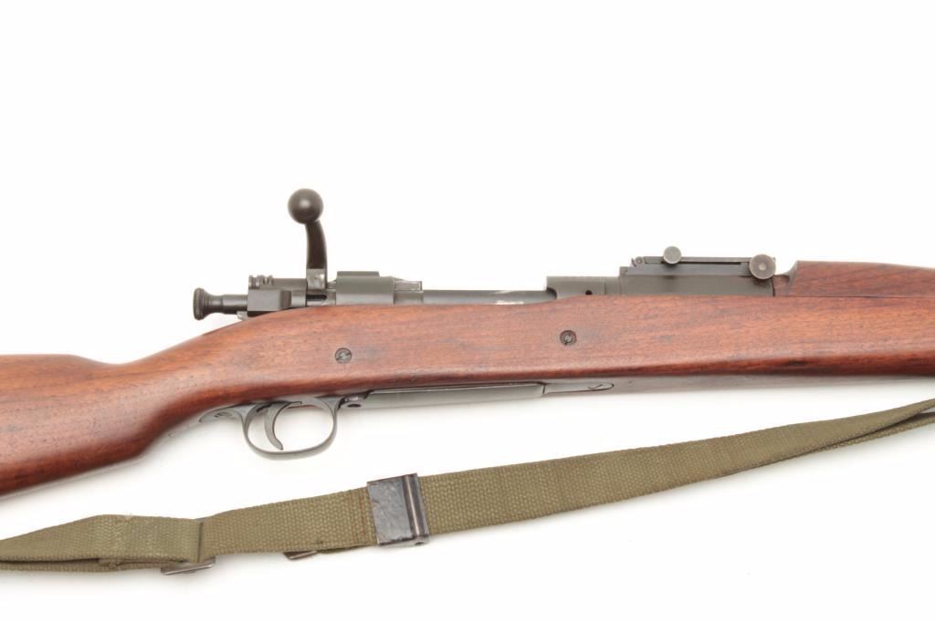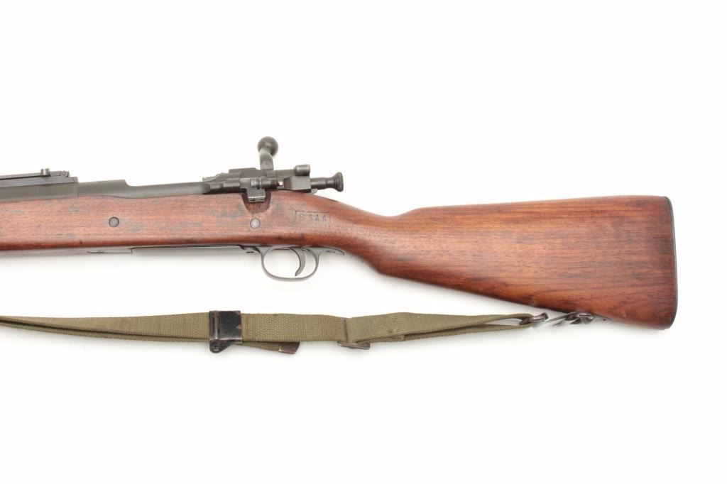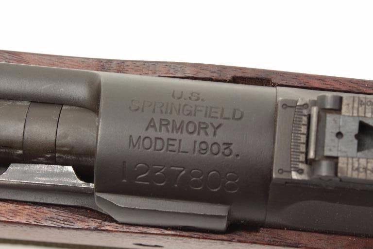 U.S. Springfield Model 1903 bolt action rifle, .30-06 caliber, 24” barrel dated 9-21, military finish, wood stock, olive green woven sling, S/N 1237808, in overall fine condition displaying the majority of itsmilitary finish, sharp markings, crisp action, good bore and fine stock with square P proof and S.S.A.A. inspector’s cartouche. (C&R). Est.: $400-$800.