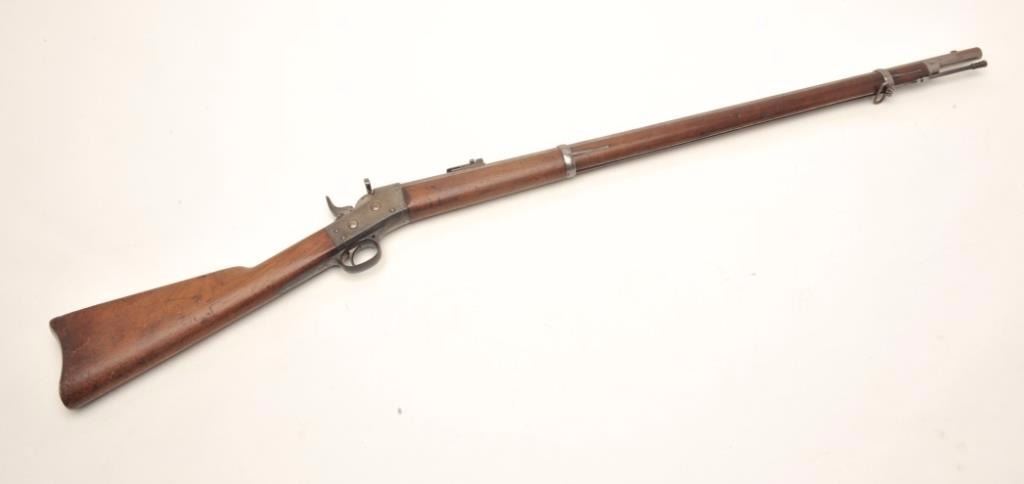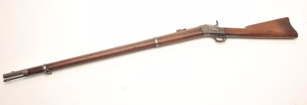 U.S. Springfield Rolling Block rifle, .50 caliber, 36” barrel, wood stocks, no visible S/N, in overall very good condition with light traces of original case color on the receiver, some scattered surface rust on thebarrel from storage; very good bore, crisp action and good markings. The wood is also good overall with some old scattered nicks and mars from carry and storage. (Antique). Est.: $400-$800.