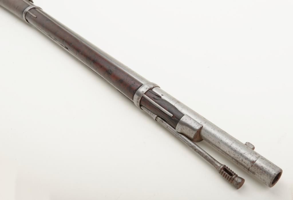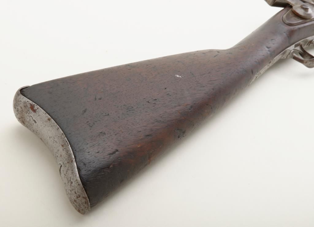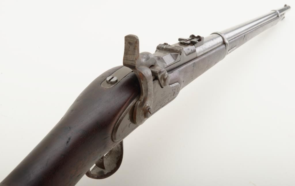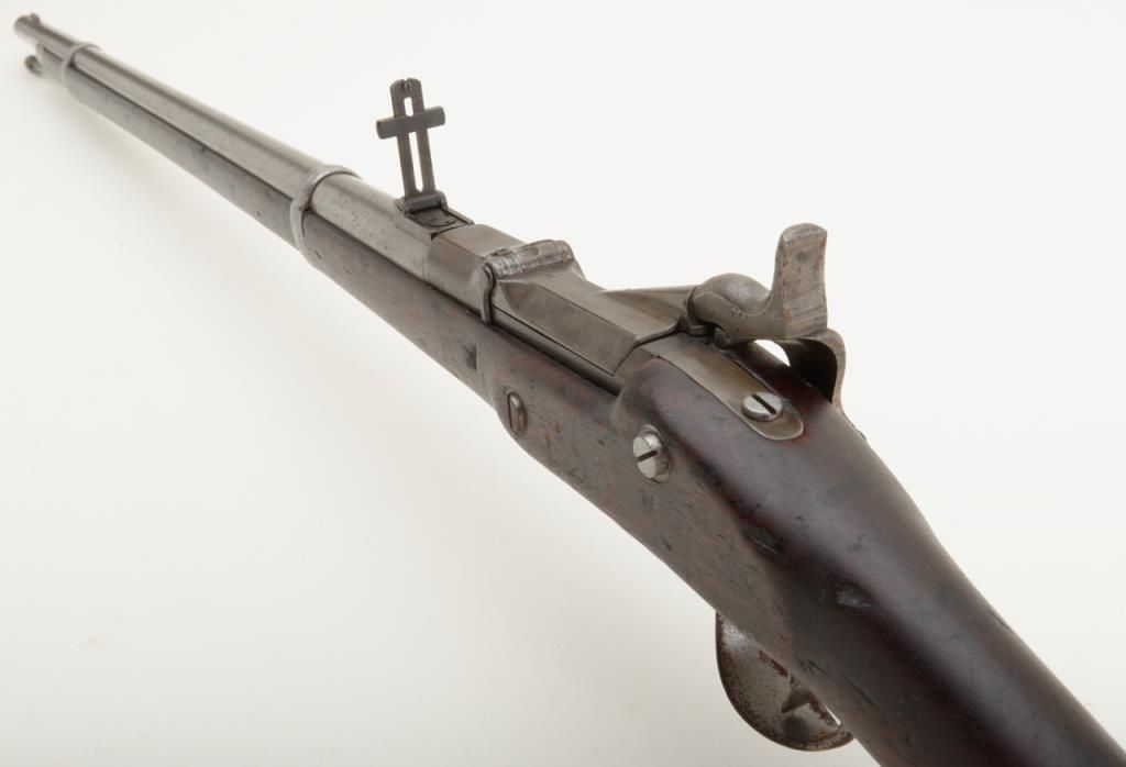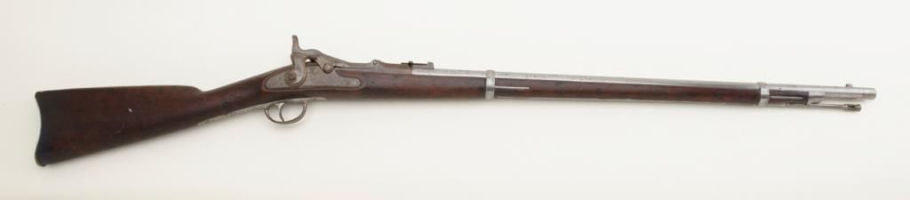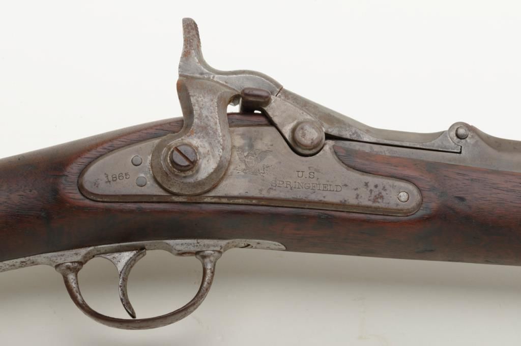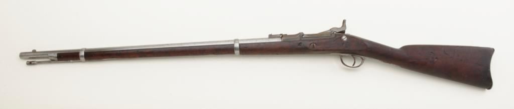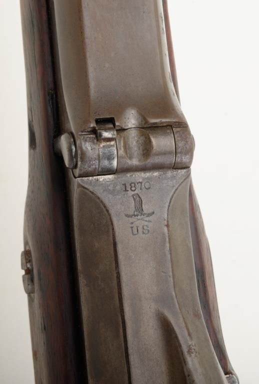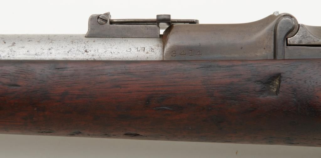 U.S. Springfield conversion rifle, .50 cal., 29-1/2” barrel, wood stock, #3414 in un-cleaned overall fair to good condition with scattered surface rust spots from long storage, good bore, crisp action, good markings including an 1865-dated lockplate and 1870 dated trapdoor; stock is worn with mars, dings and scratches. From an old estate. (Antique). Est.: $250-$500.