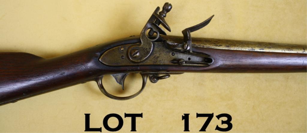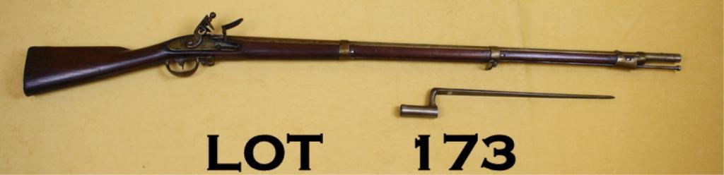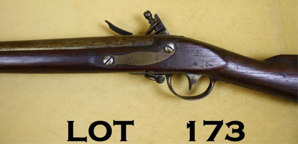 U.S. Springfield flintlock musket with socket bayonet, lock dated 1813, .69 cal., 42” barrel, bright finish, full wood stock, three barrel bands, two sling swivels, top of barrel is US marked at breech and “P” and “V” proofed. This early Springfield is in overall good condition showing a brown patina over bright finished metal surfaces with some scattered spots of erosion and pin prick pitting; visible “US” and “Springfield” a little light with partially visible spread eagl on lock plate, 1813 is horizontally marked on rear of lock plate; good action; overall good wood stock with scattered areas of wear, mars and scratches from carry and storage, flared iron ramrod retained, top of steel butt plate dated “1815”; left side of butt stock shows an indentation at the comb for resting the cheek; bayonet is in overall fair + condition and marked “US” “SC” at the base of the triangular blade. Est.: $1,500-$2,000.