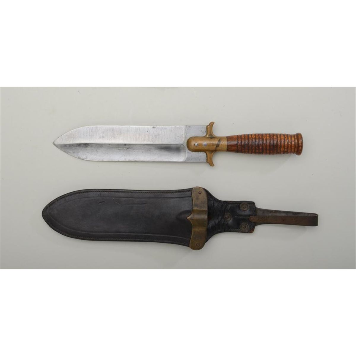 U.S. Springfield marked hunter’s knife with brass cross guard numbered 1534, grooved wood grip with RIA marked leather sheath displaying brass hanger and brass throat to sheath. The knife is in overall very goodcondition as is the leather sheath. Est.: $200-$400.