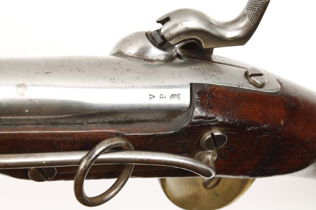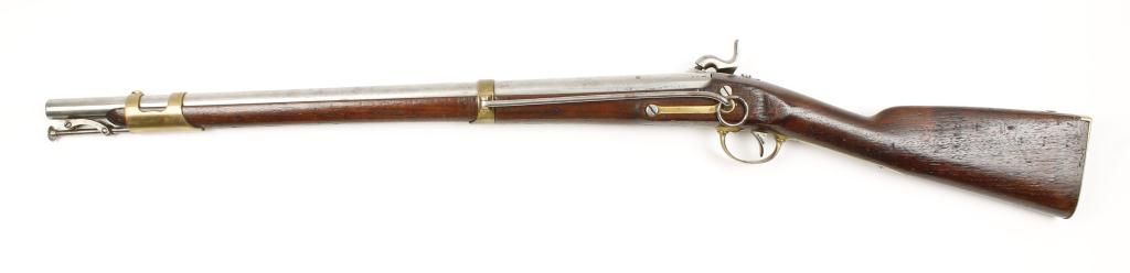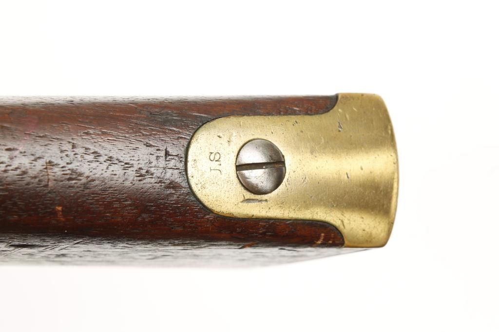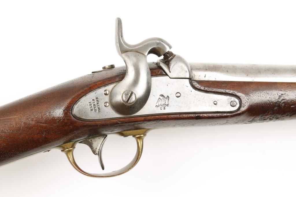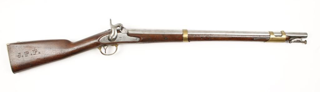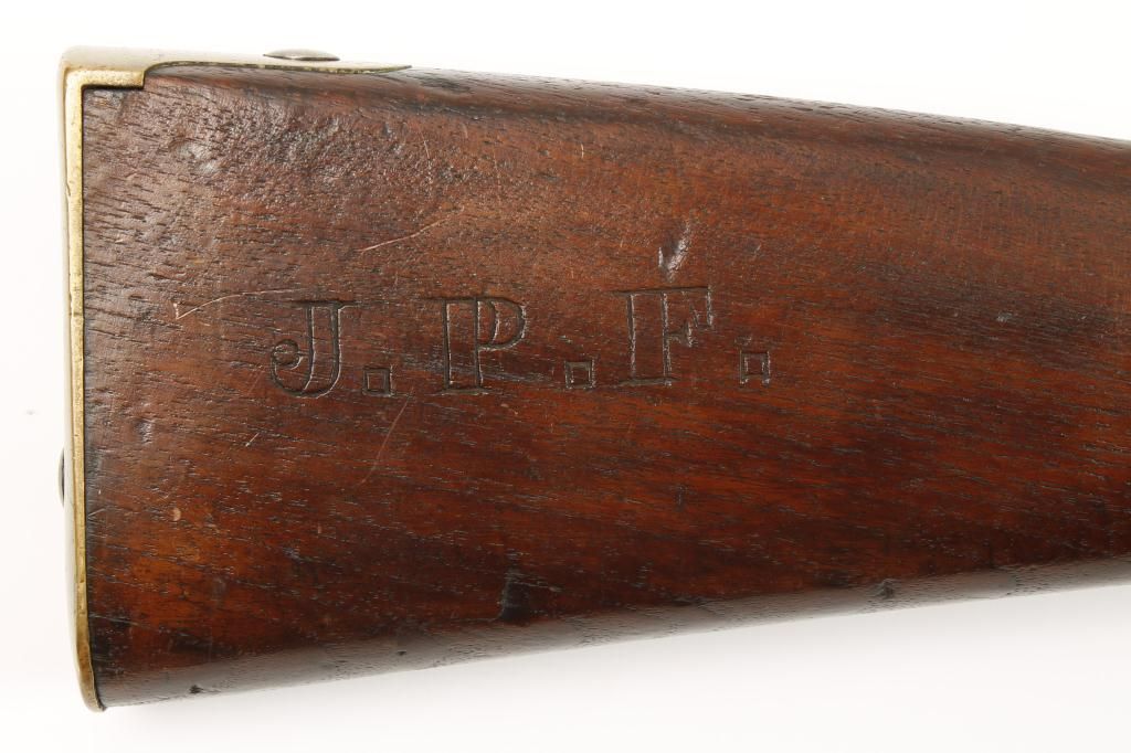 U.S. Springfield percussion Cavalry Musketoon, .70 cal., 26” barrel dated 1851, swivel ramrod, lockplate dated 1853, saddlering on long bar, brass trigger guard, barrel bands and butt plate, wood stock. This gun is in overall very good condition showing a bright barrel, good eagle and US on lockplate as well as Springfield and date; crisp action and crisp V, P and eagle head on barrel at breech; US at top of butt plate;very good wood with “J.P.F.” carved in right side of butt stock; a really nice example in better than usually found condition. Est.: $2,000-$4,000.
