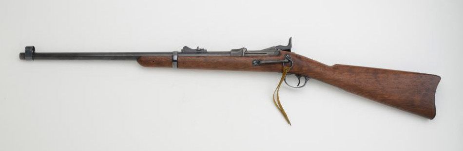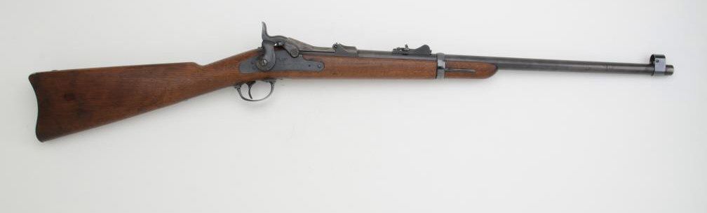 U.S. Springfield trapdoor carbine, .45-70 cal., 22” barrel, blue and case hardened finish, wood stock, #177652*. This gun is in overall very good condition as reconditioned showing the majority of its military finish,crisp action, bore shows some areas of pitting, overall good markings, stock is overall good with faint circle P proof behind trigger guard and “32” stamped between back of guard and P proof; faint appearance of“34” on right side of butt stock; no other visible cartouches. Est.: $1,000-$1,800.