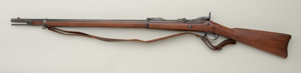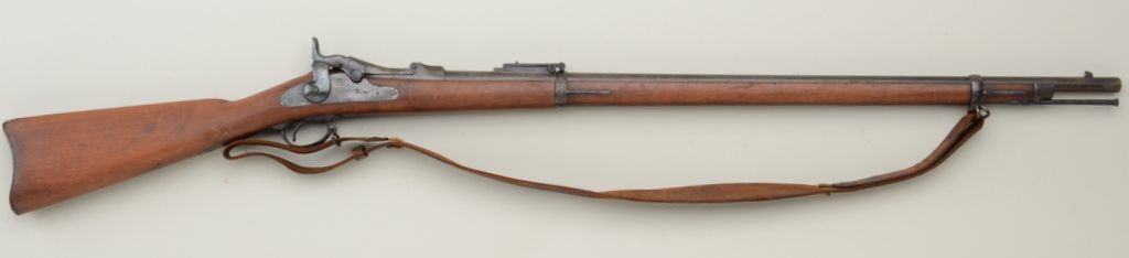 U.S. Springfield trapdoor rifle, .45-70 cal., 32-1/2” barrel, blue and case hardened finish, top of trapdoor dated 1884; full wood stock, iron cleaning rod, old leather sling, #339618. This gun is in overall goodcondition showing some blue on barrel and case hardened finish gone to a silvery tone on lock plate and receiver; some scattered surface rust and spots of erosion; good bore, crisp action, good markings, overall goodwood stock with traces of inspector cartouche on left side of stock above trigger and scattered mars from carry and storage. Est.: $250-$400.