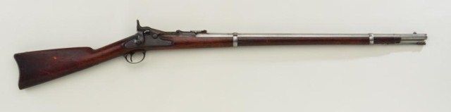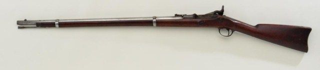 U.S. Springfield trapdoor rifle, dated 1870 on the trapdoor with eagle over crossed arrows and US, .50 cal., 29-3/4” barrel, two barrel bands, wood stock, #1909 on left side of barrel at breech and same number adjacenton the frame. This gun is in overall very good condition with the barrel showing a light grey patina over pin prick pitting, dark patina on receiver and lockplate, good bore, crisp action, sharp markings, very good wood stock with some scattered mars and scratches from storage; top of butt plate stamped “A 13”; may be a Cadet or Cadet Variation rifle; should be further researched. Est.: $700-$1,400.