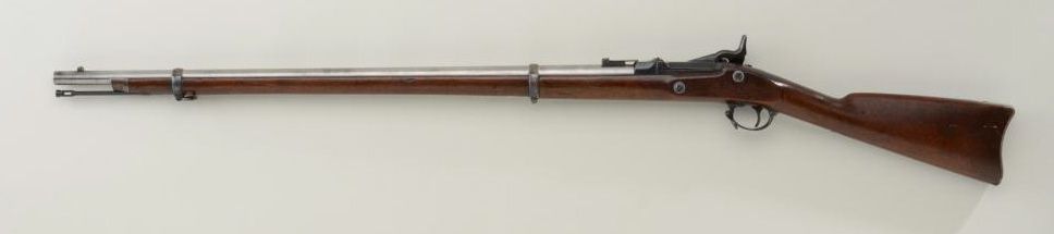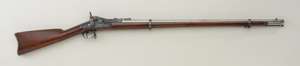 U.S. Springfield trapdoor rifle marked 1870, .50 cal., 32-1/2” barrel, lockplate is dated 1863, high arch breech block, wood stock, #NVSN. This gun is in overall good condition showing a reblued receiver and lockplate with barrel cleaned to “in the white”; good bore and action, stock is overall very good with a slight trace of a cartouche on the left side of the stock above the trigger assembly. Est.: $600-$1,200.