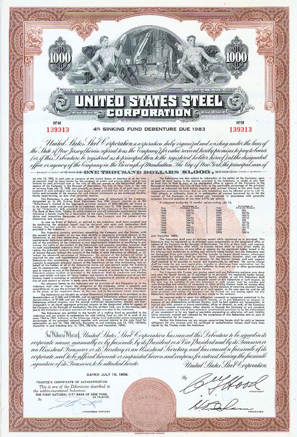 1958. New Jersey. Bond for $1,000. Brown/Black. Large top center engraved vignette of men working in the steel factory flanked by allegorical males. Punch cancelled and very fine.